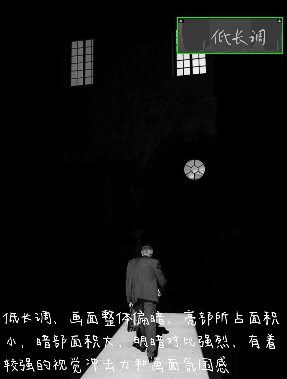 3.影调:低长调,画面整体偏暗,亮部所占面积小,暗部面积大,明暗对比强烈,有着较强的视觉冲击力和画面氛围感