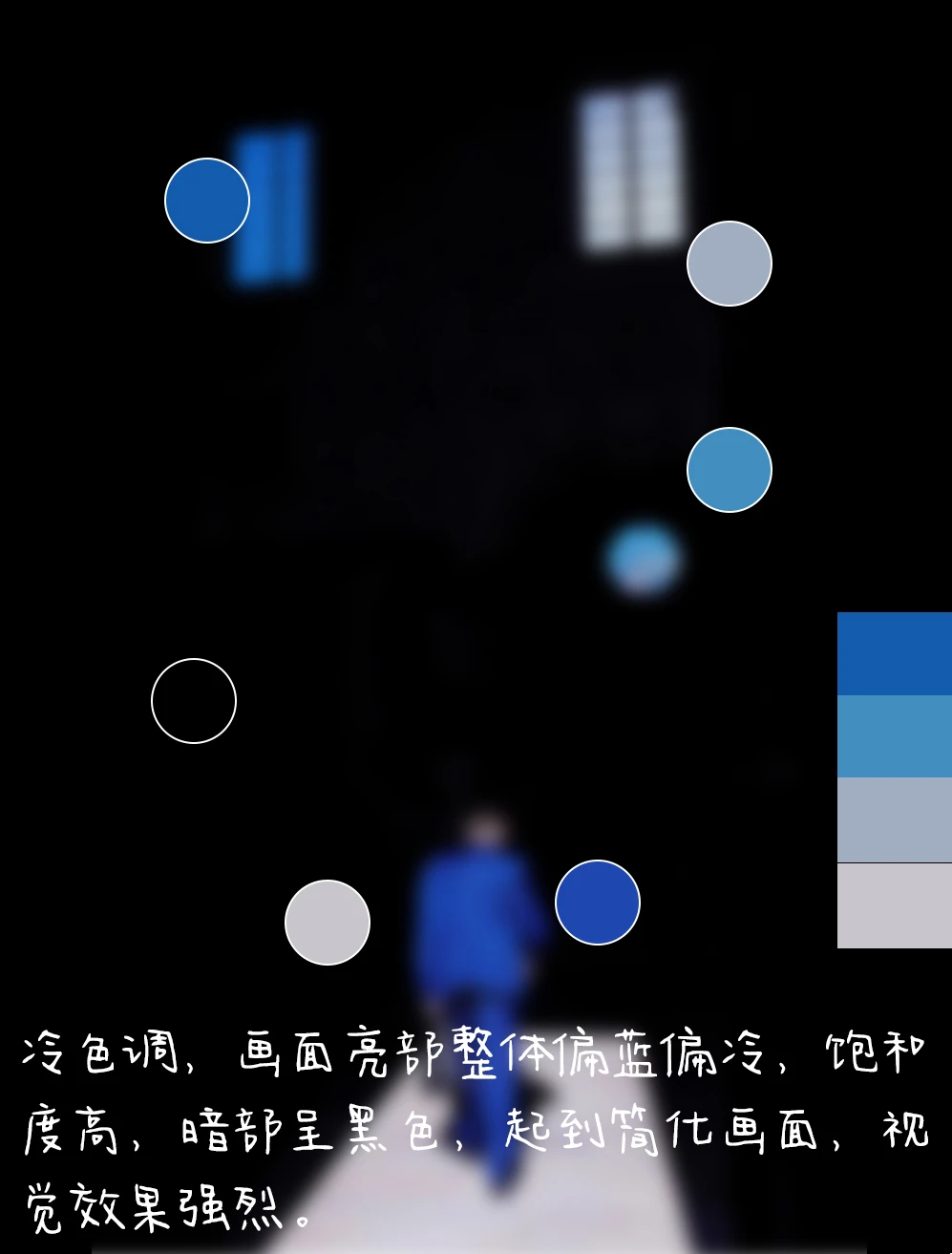 4.色调:冷色调,画面亮部整体偏蓝偏冷,饱和度高,暗部呈黑色,起到简化画面,视觉效果强烈。
