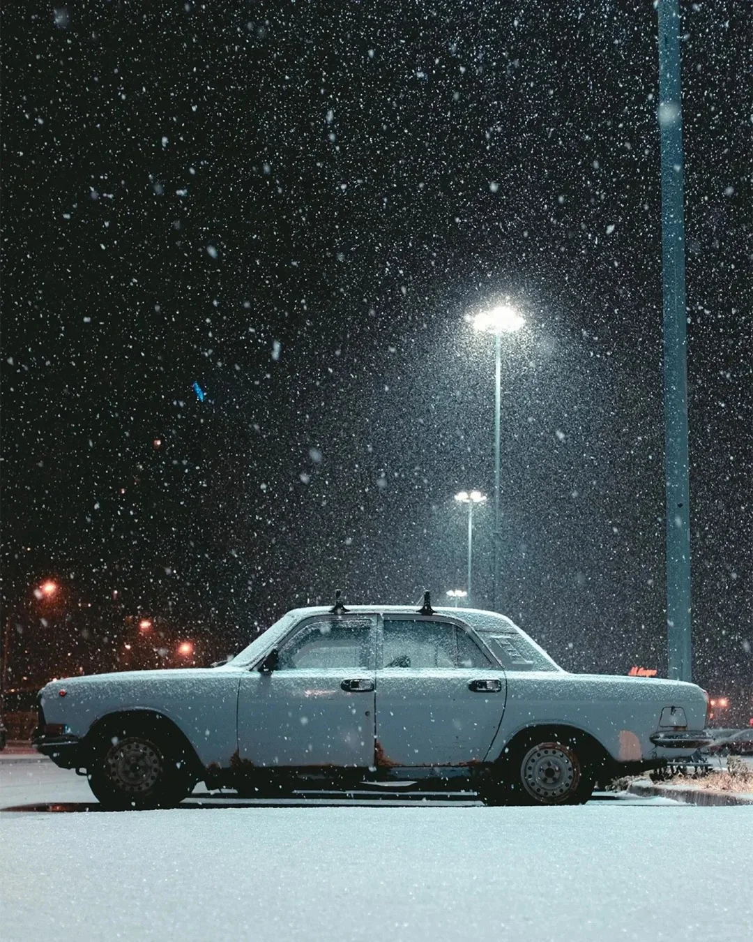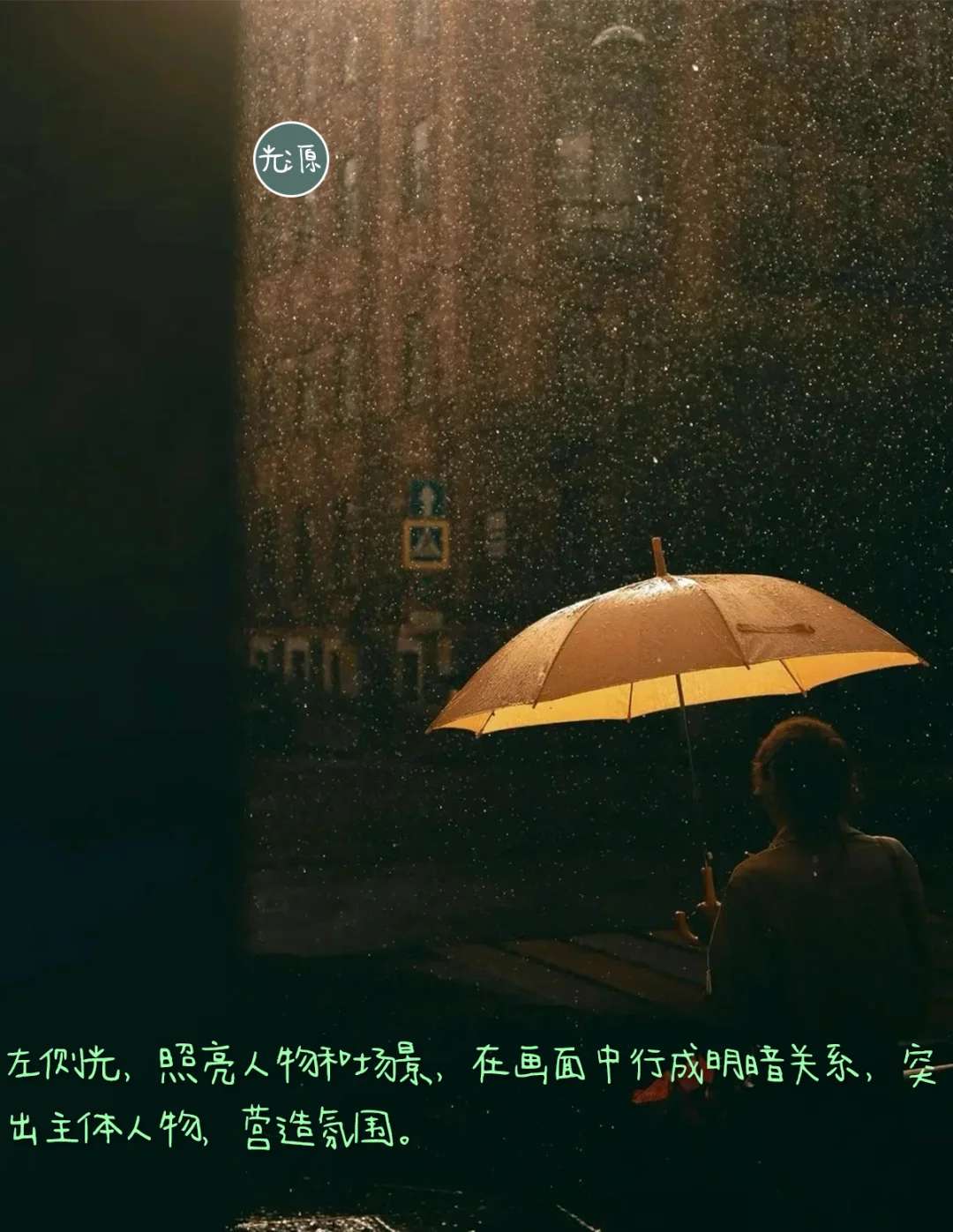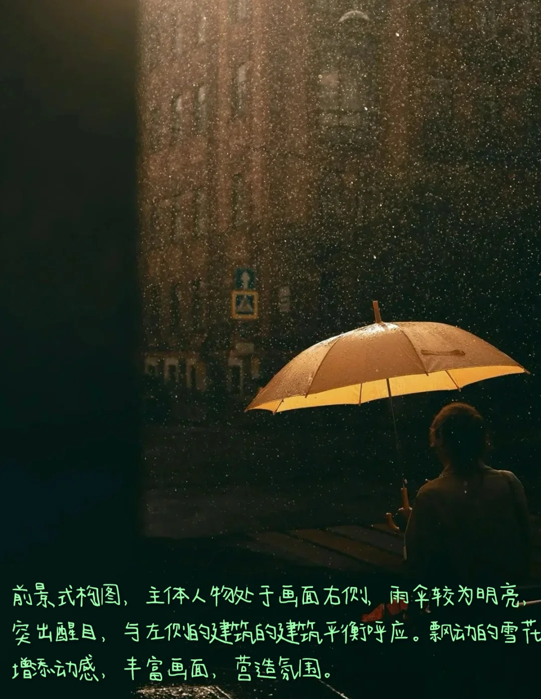 1.构图:前景式构图,主体人物处于画面右侧,雨伞较为明亮,突出醒目,与左侧的建筑的建筑平衡呼应。飘动的雪花增添动感,丰富画面,营造氛围。