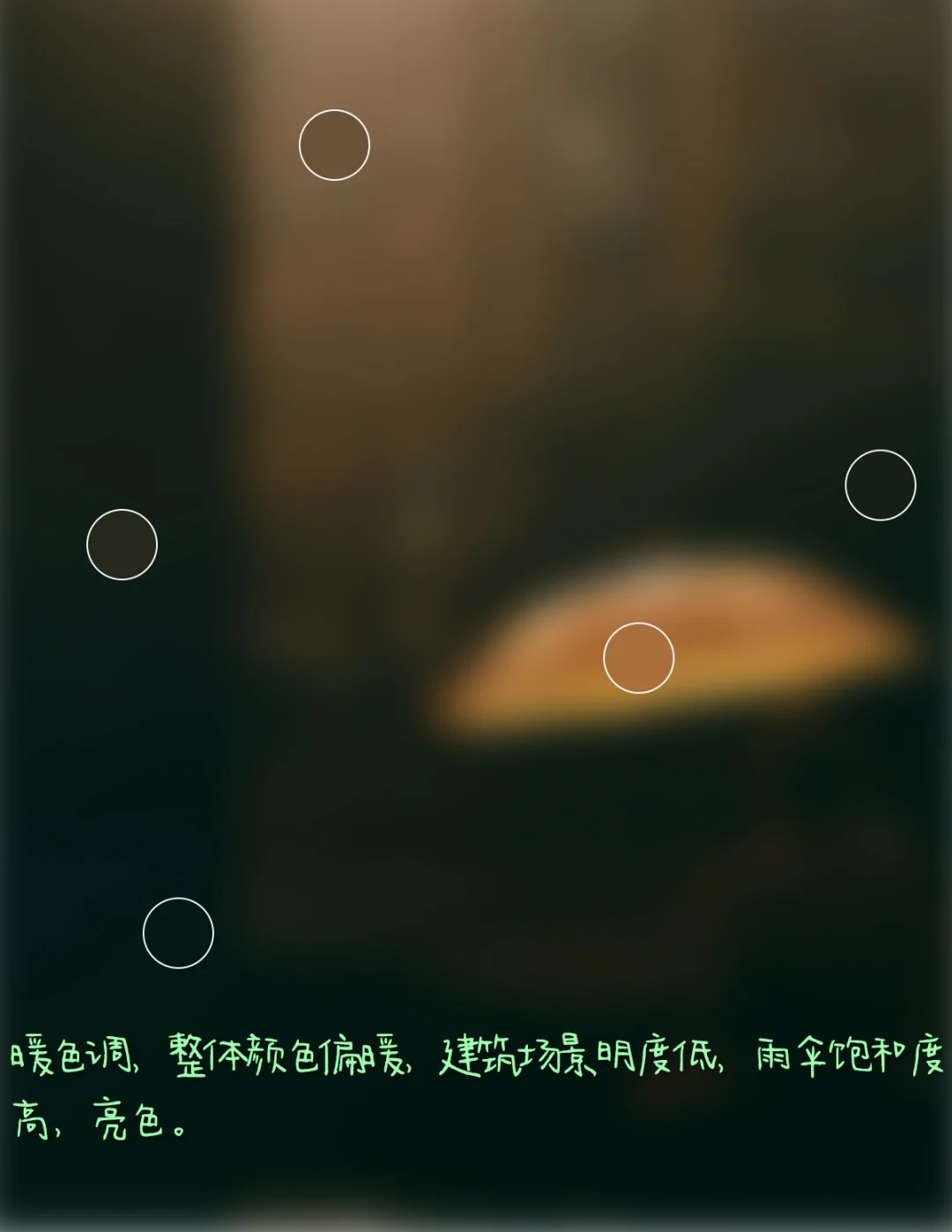 4.色彩:暖色调,整体颜色偏暖,建筑场景明度低,雨伞饱和度高,亮色。