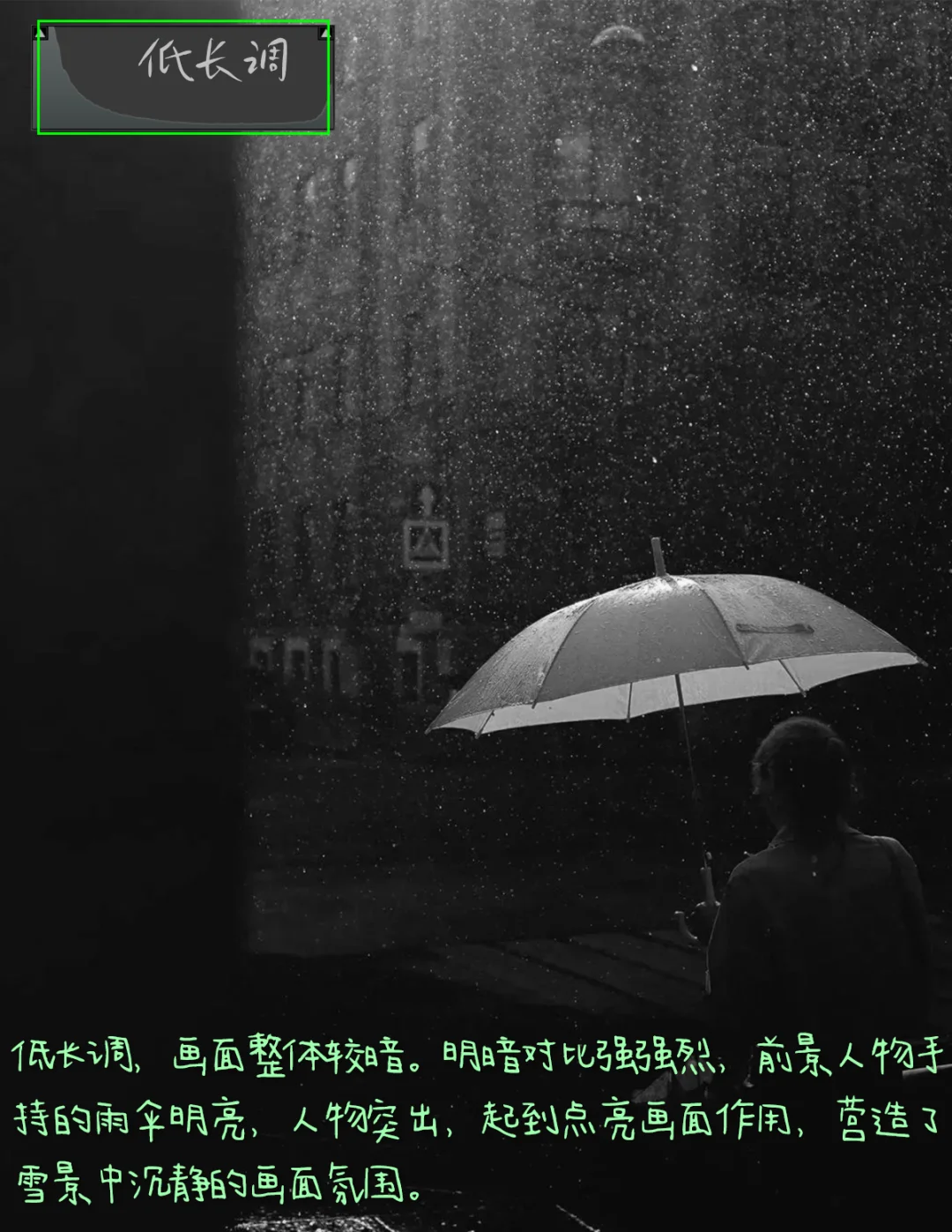3.影调,低长调,画面整体较暗。明暗对比强强烈,前景人物手持的雨伞明亮,人物突出,起到点亮画面作用,营造了雪景中沉静的画面氛围。