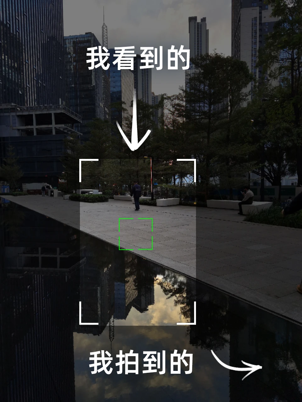 [五R][六R]:水池里倒影,傍晚日落时刻,等待行人路过,拍摄人物与建筑的倒影。