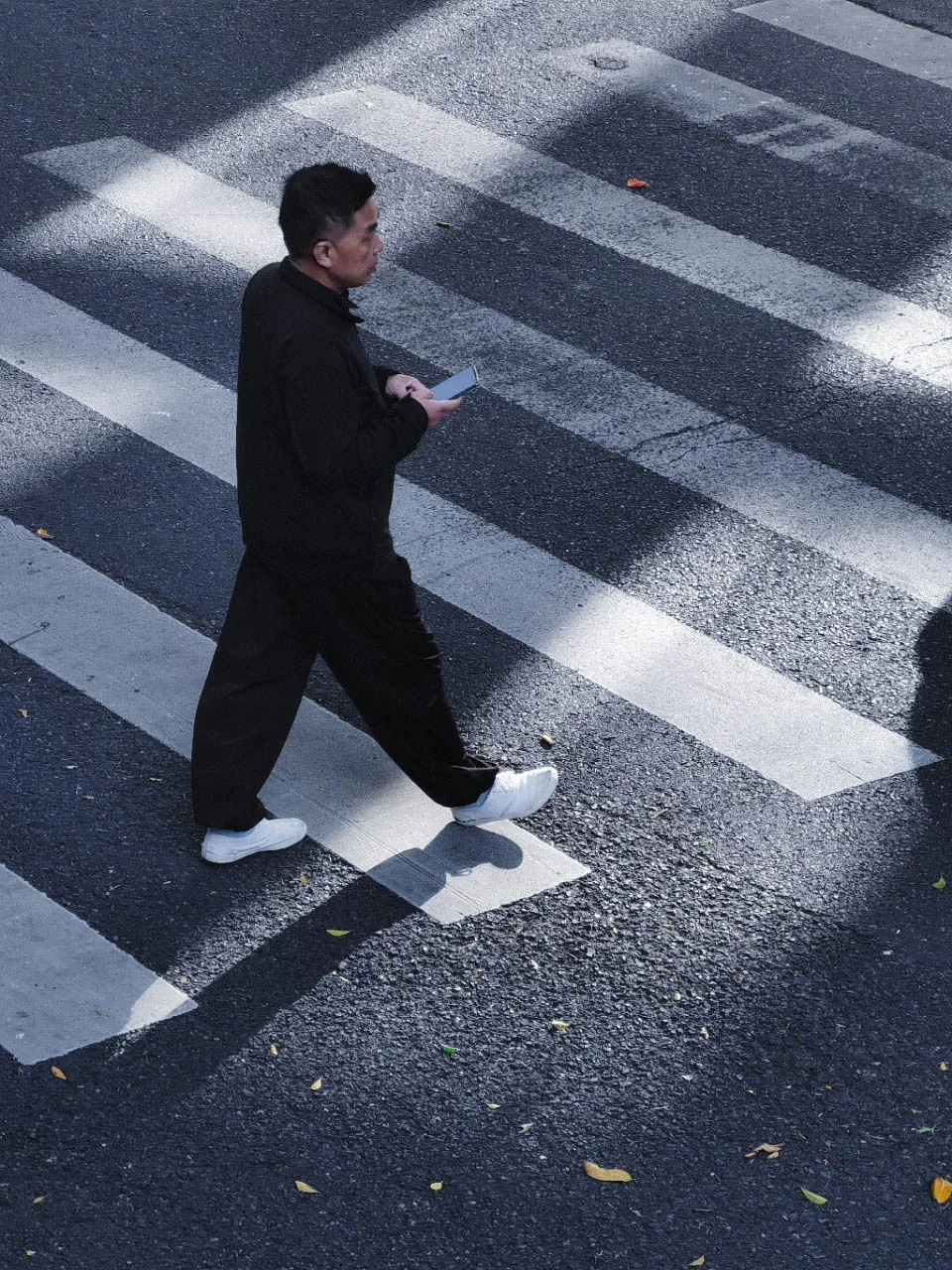 [一R][二R]:早晨的斑马线,降低曝光度;找一个适合俯拍的位置,用长焦镜头聚焦到斑马线,拍摄行人从斑马线行走。