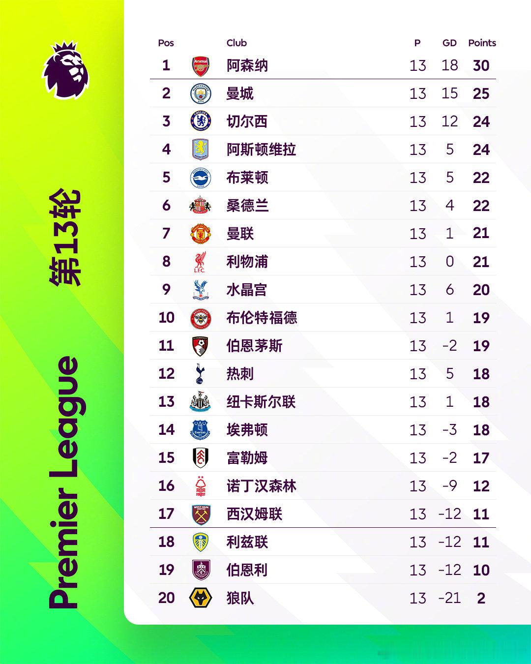2025/26赛季英超第13轮10场战罢:◉ 阿森纳战平切尔西,5分优势领跑◉ 曼联击败水晶宫,升至第7◉ 利物浦击败西汉姆联,升至第8英超联赛 cr:英超联赛