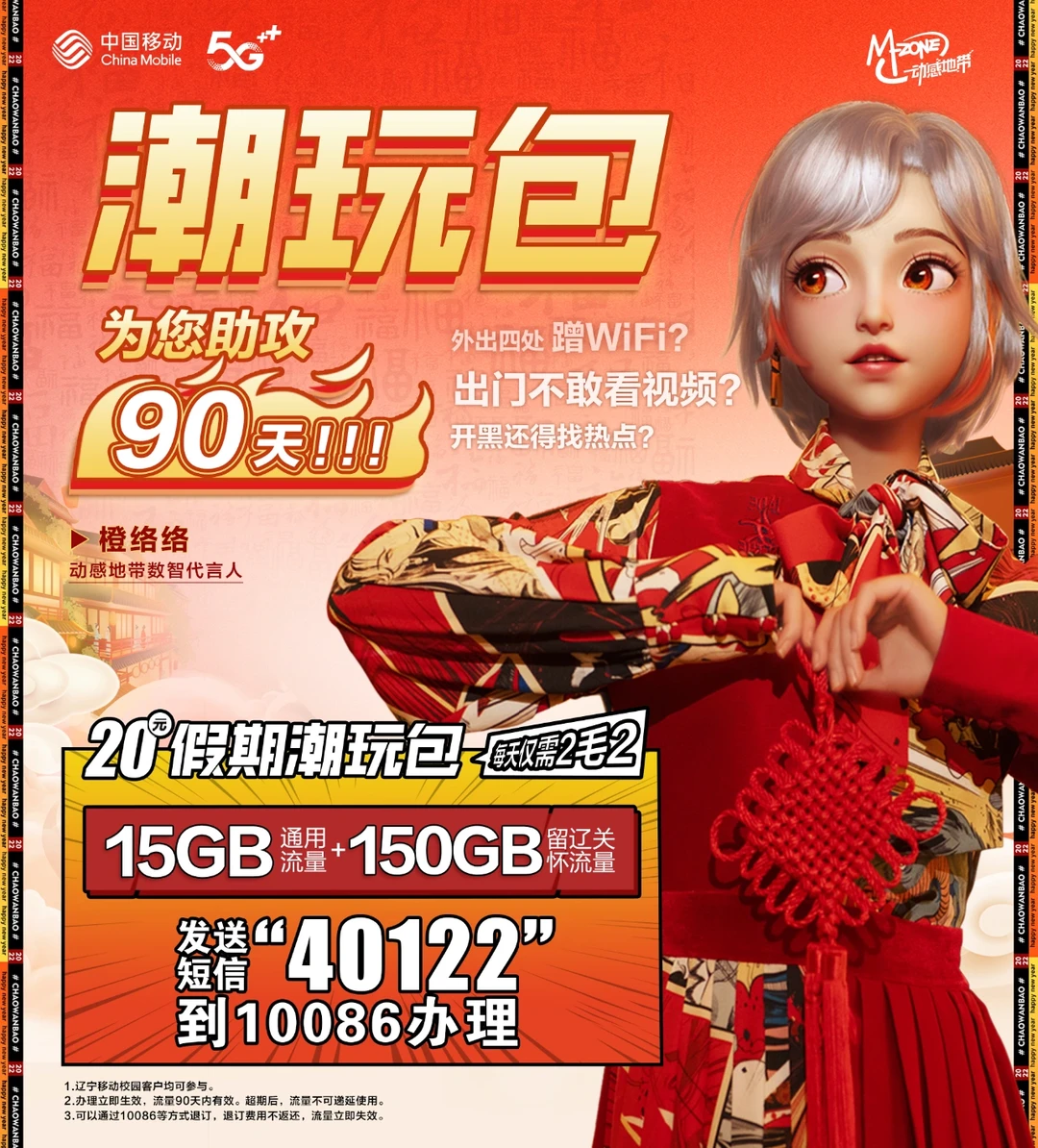 我一直用的中国移动,流量哗哗用都不用愁,现在又快又好用的动感地带出了【潮玩包】。20元165GB 90天不出辽宁都可以尽情用(发短信40122→10086)