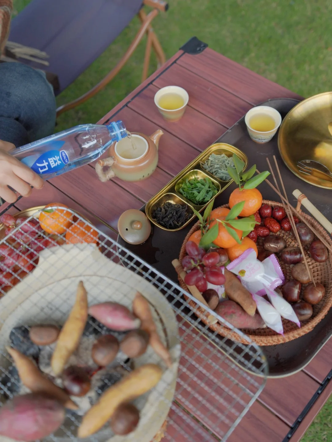 入住积木物语·斑斓露营地,马上把围炉煮茶中式主题下午茶安排上,有红薯,板栗,橘子,棉花糖,红枣等,露营地有特色的班兰茶,源自东南亚的风味,淡而有清幽的香气,喝起来很舒服。