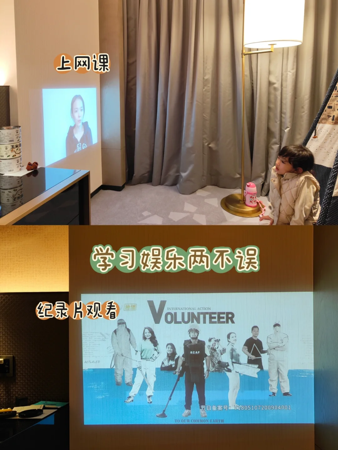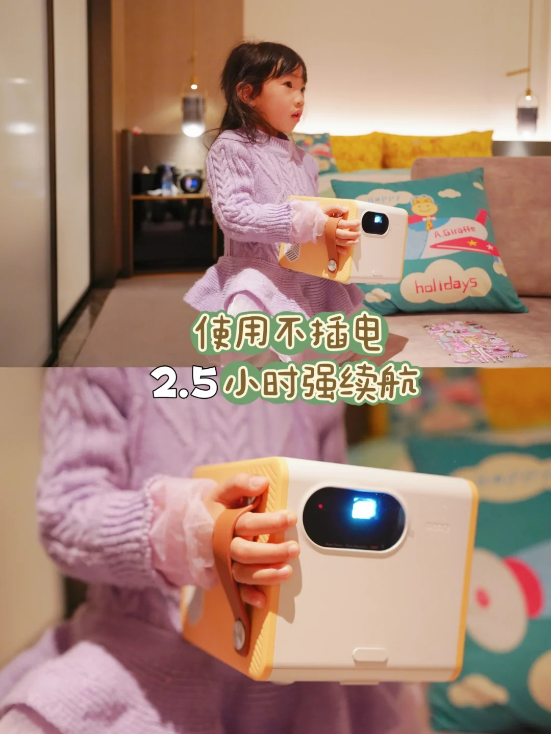 不出门的生活变得有趣[彩虹R],宅家使用很方便,因为是无线的,你完全不需要担心家里没有预埋投影线,或者插头使用不够,续航强,提前充好电就可以看两个半小时[赞R],小小一个也不重,孩子平常拎来拎去。