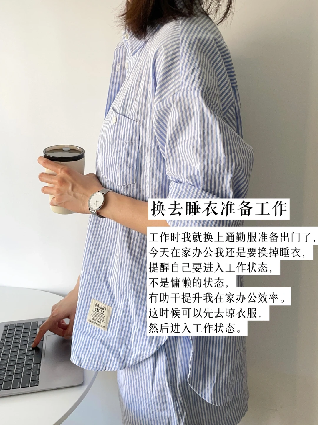 工作时我就换上通勤服准备出门了,今天在家办公我还是要换掉睡衣,提醒自己要进入工作状态,不是慵懒的状态,有助于提升我在家办公效率。这时候可以先去晾衣服,然后进入工作状态。