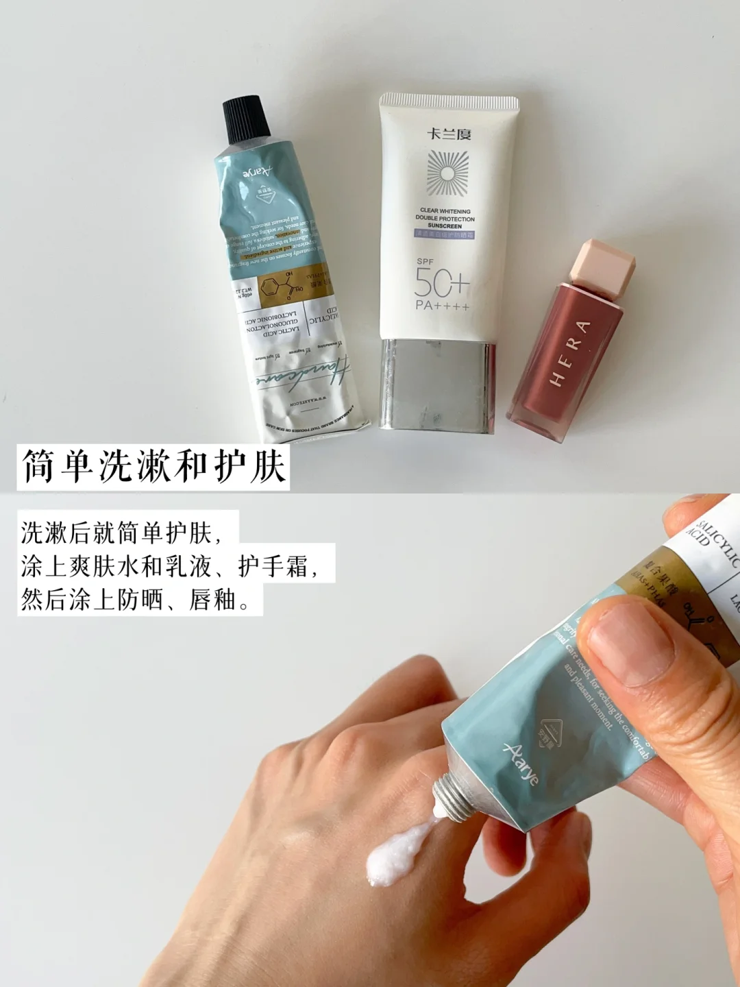 早上洗漱和护肤都很简单,涂上爽肤水和乳液、护手霜,然后涂上防晒、唇釉。