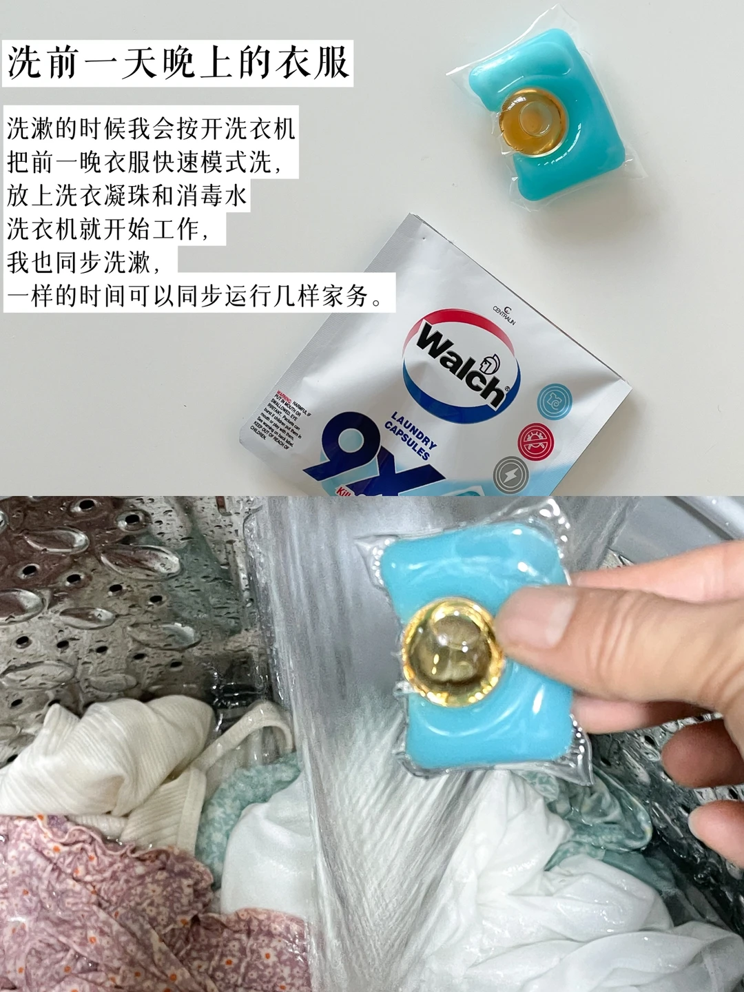 洗漱的时候我会按开洗衣机把前一晚衣服快速模式洗,放上洗衣凝珠和消毒水就洗衣机就开始工作,我也同步洗漱,一样的时间可以同步运行几样家务。