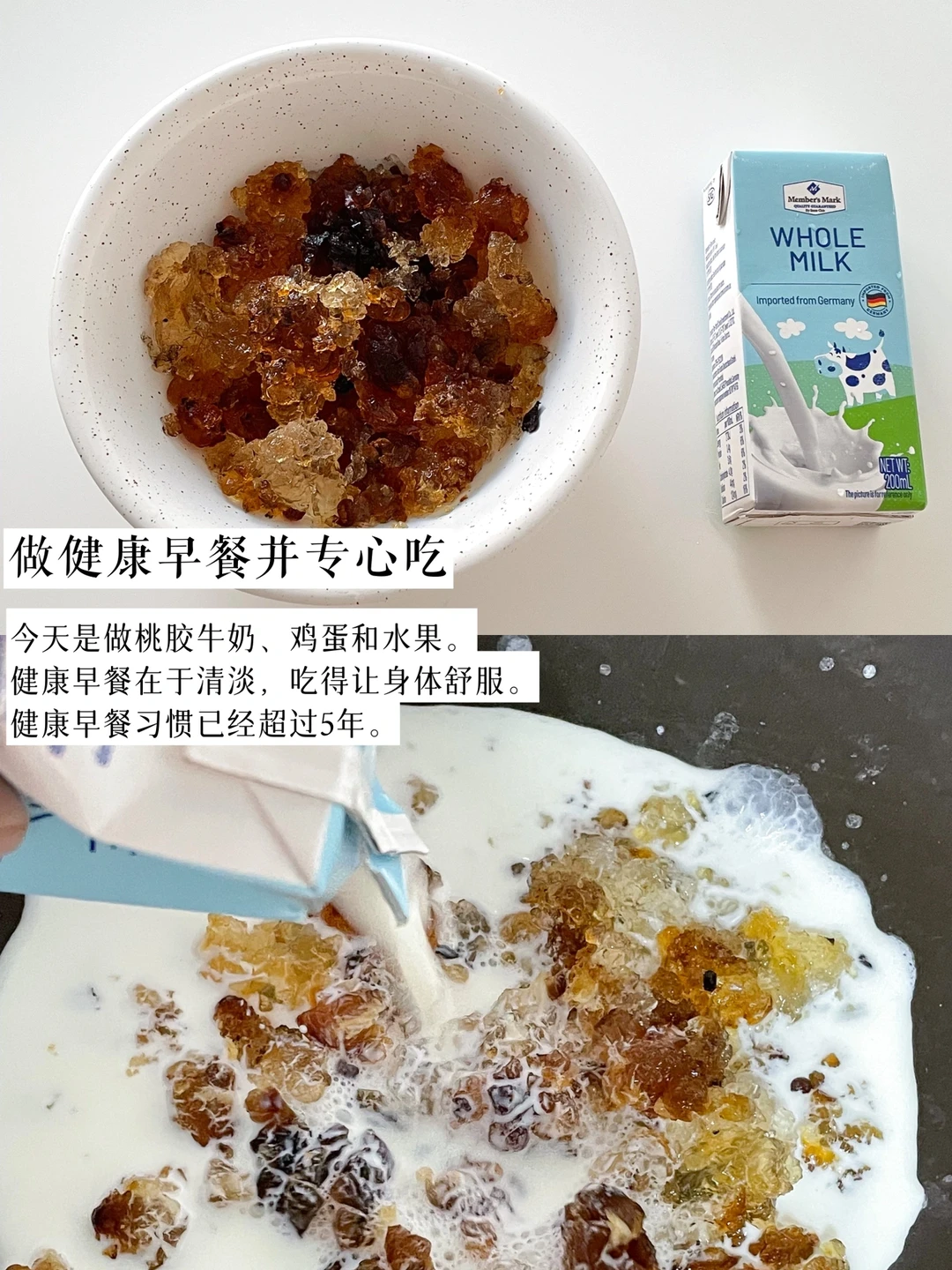 今天是做桃胶牛奶、鸡蛋和水果。健康早餐在于清淡,吃得让身体舒服。健康早餐习惯已经超过5年,我已经是30岁的养生小姐姐了,还煮了酸梅汤,三伏天里消暑解渴,断舍离外面的饮料特别是冰饮。