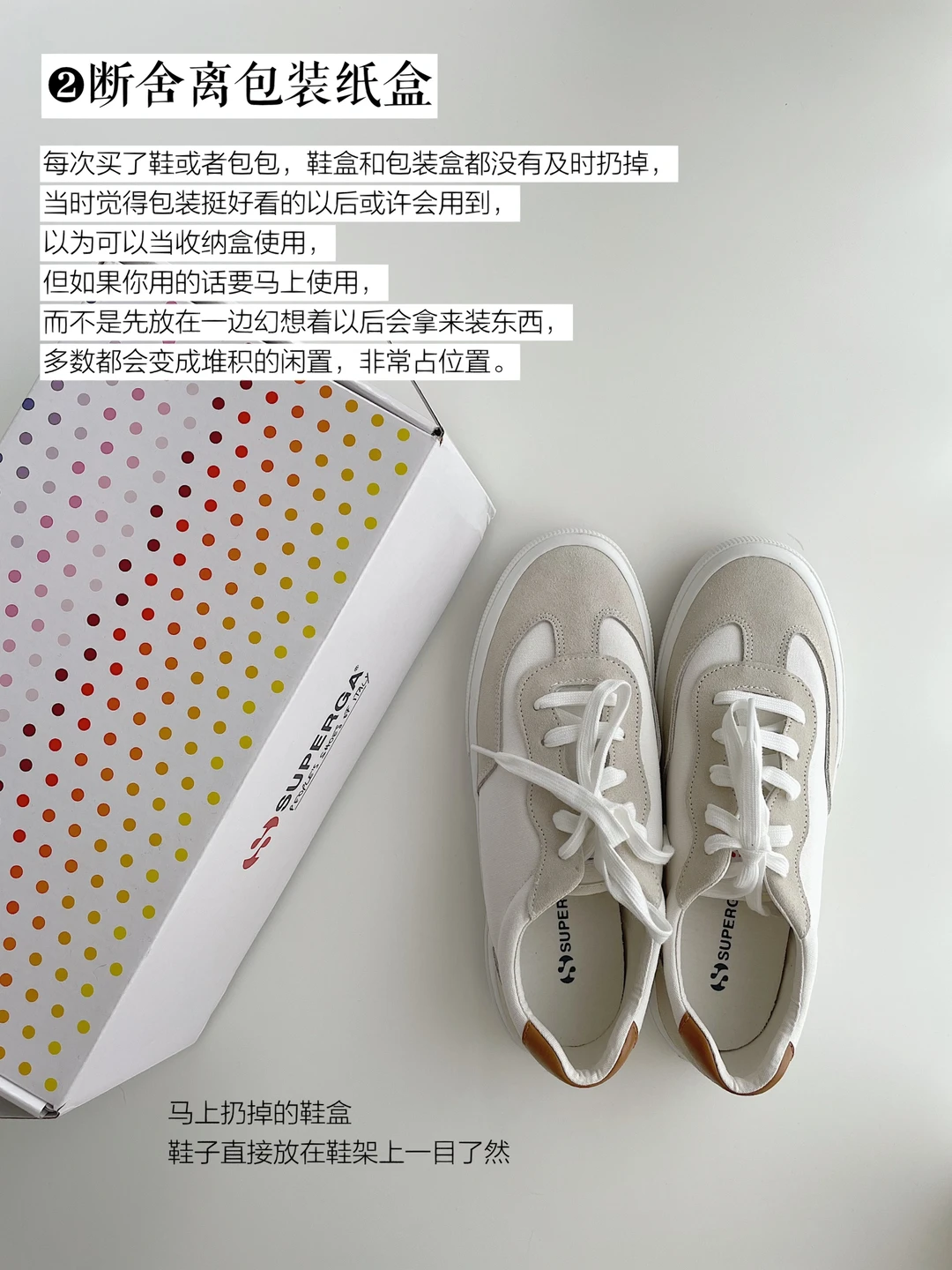 每次买了鞋或者包包,鞋盒和包装盒都没有及时扔掉,当时觉得包装挺好看的以后或许会用到,以为可以当收纳盒使用,但如果你用的话要马上使用,而不是先放在一边幻想着以后会拿来装东西,多数都会变成堆积的闲置,非常占位置。