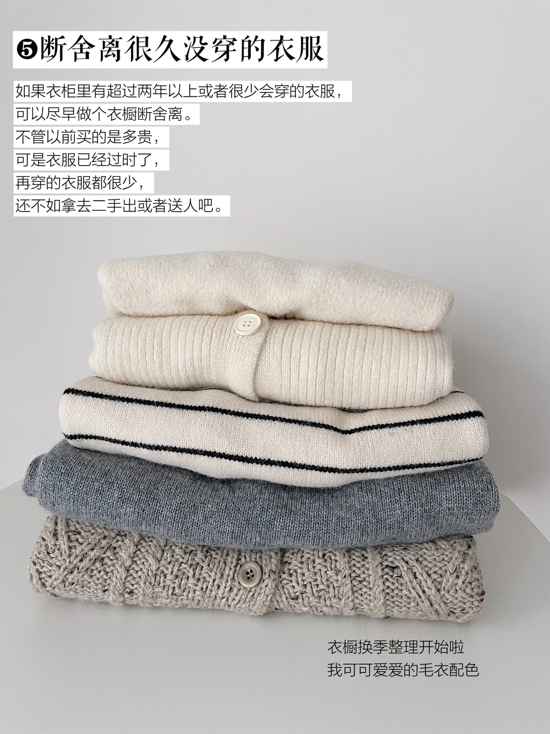 如果衣柜里有超过两年以上或者很少会穿的衣服,可以尽早做个衣橱断舍离。不管以前买的是多贵,可是衣服已经过时了,再穿的衣服都很少,还不如拿去二手出或者送人吧。