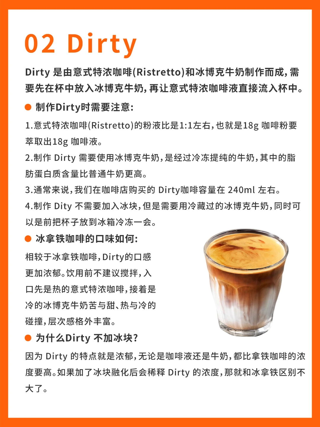 Dirty 是由意式特浓咖啡(Ristretto)和冰博克牛奶制作而成,需要先在杯中放入冰博克牛奶,再让意式特浓咖啡液直接流入杯中。