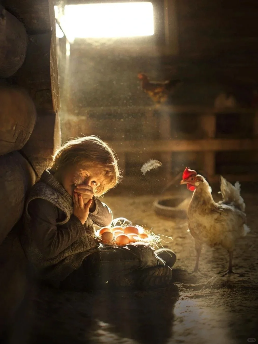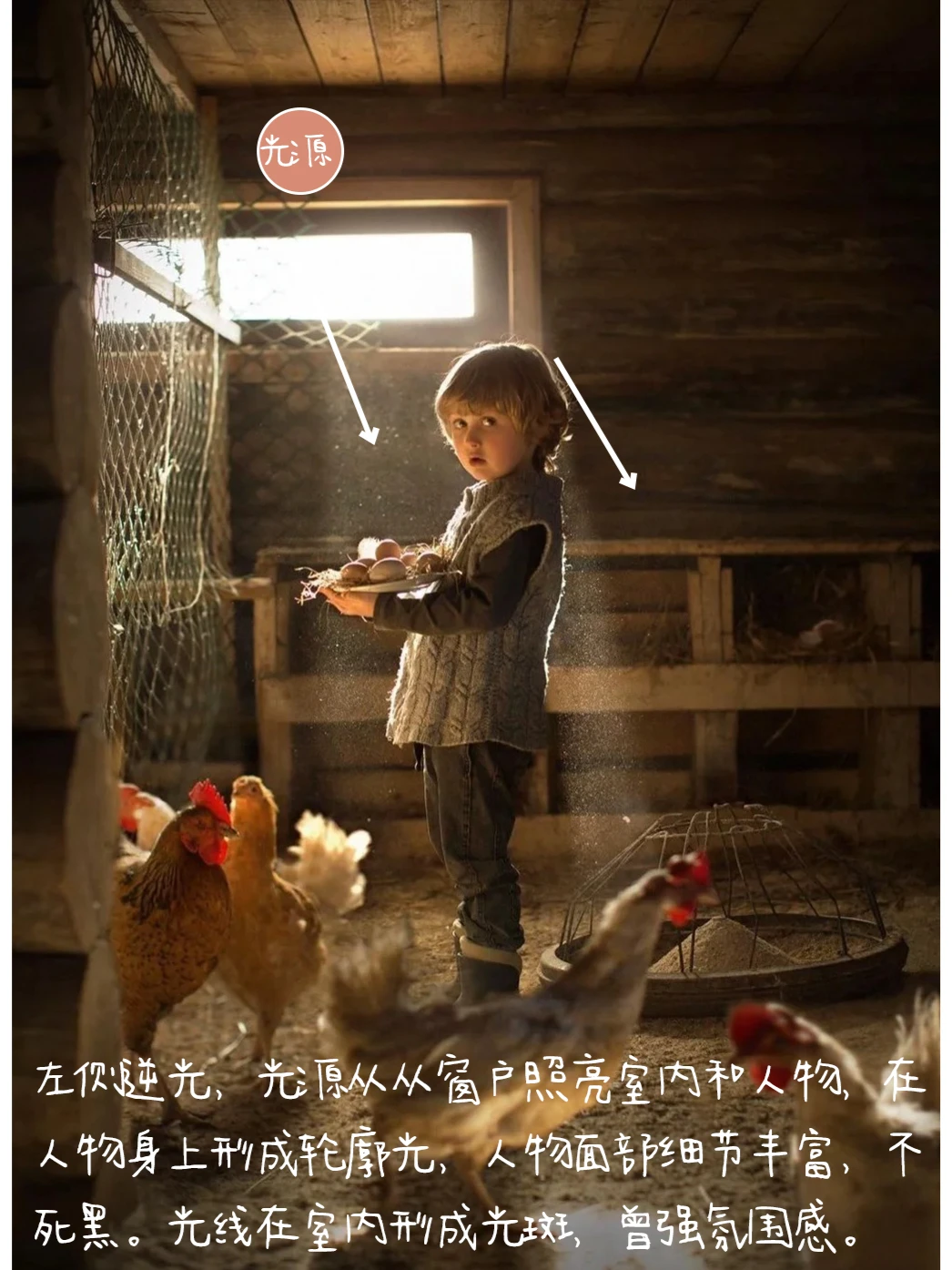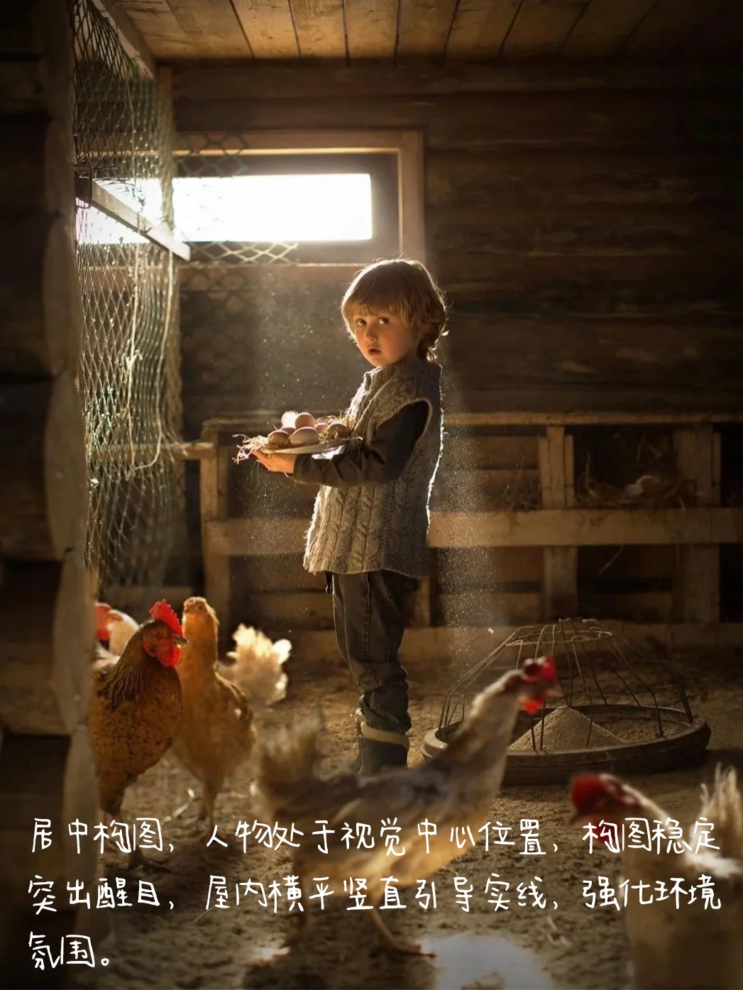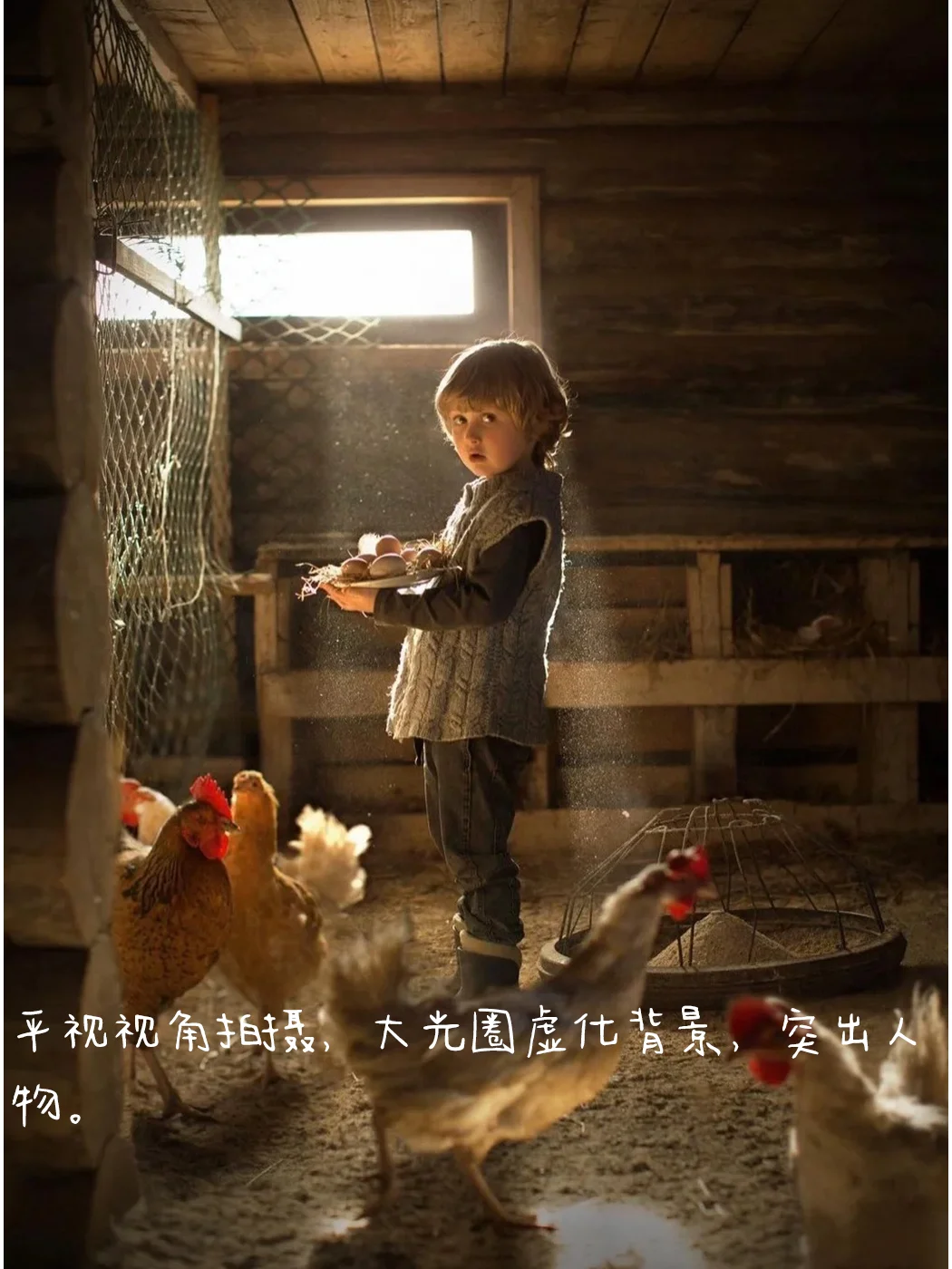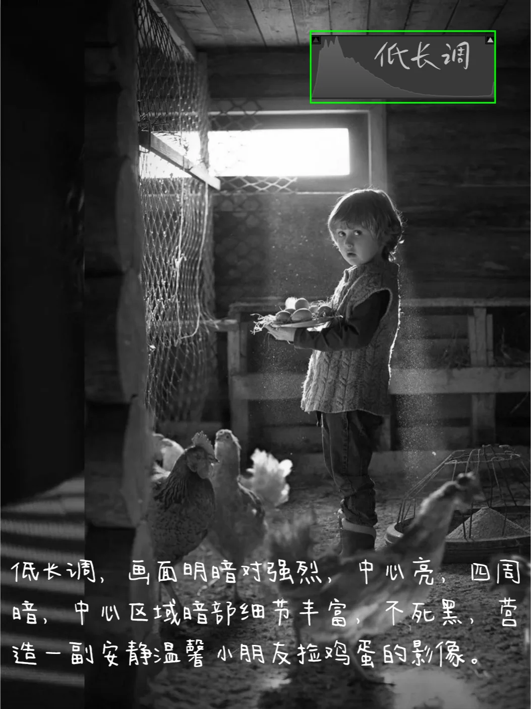 3.影调:低长调,画面明暗对强烈,中心亮,四周暗,中心区域暗部细节丰富,不死黑,营造一副安静温馨小朋友捡鸡蛋的影像。