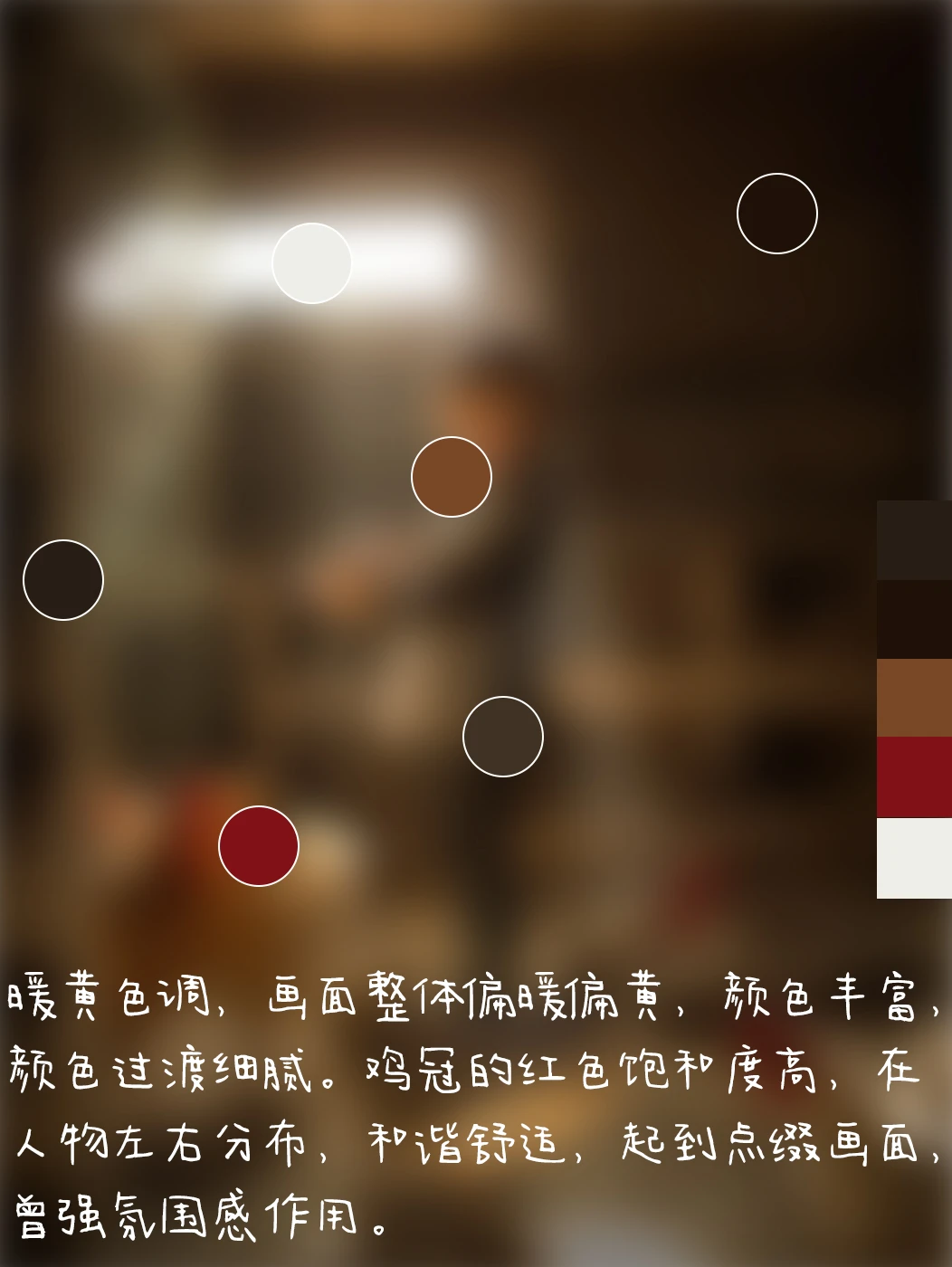 4.色彩:暖黄色调,画面整体偏暖偏黄,颜色丰富,颜色过渡细腻。鸡冠的红色饱和度高,在人物左右分布,与整体色调呈邻近色,和谐舒适,起到点缀画面,曾强氛围感作用。