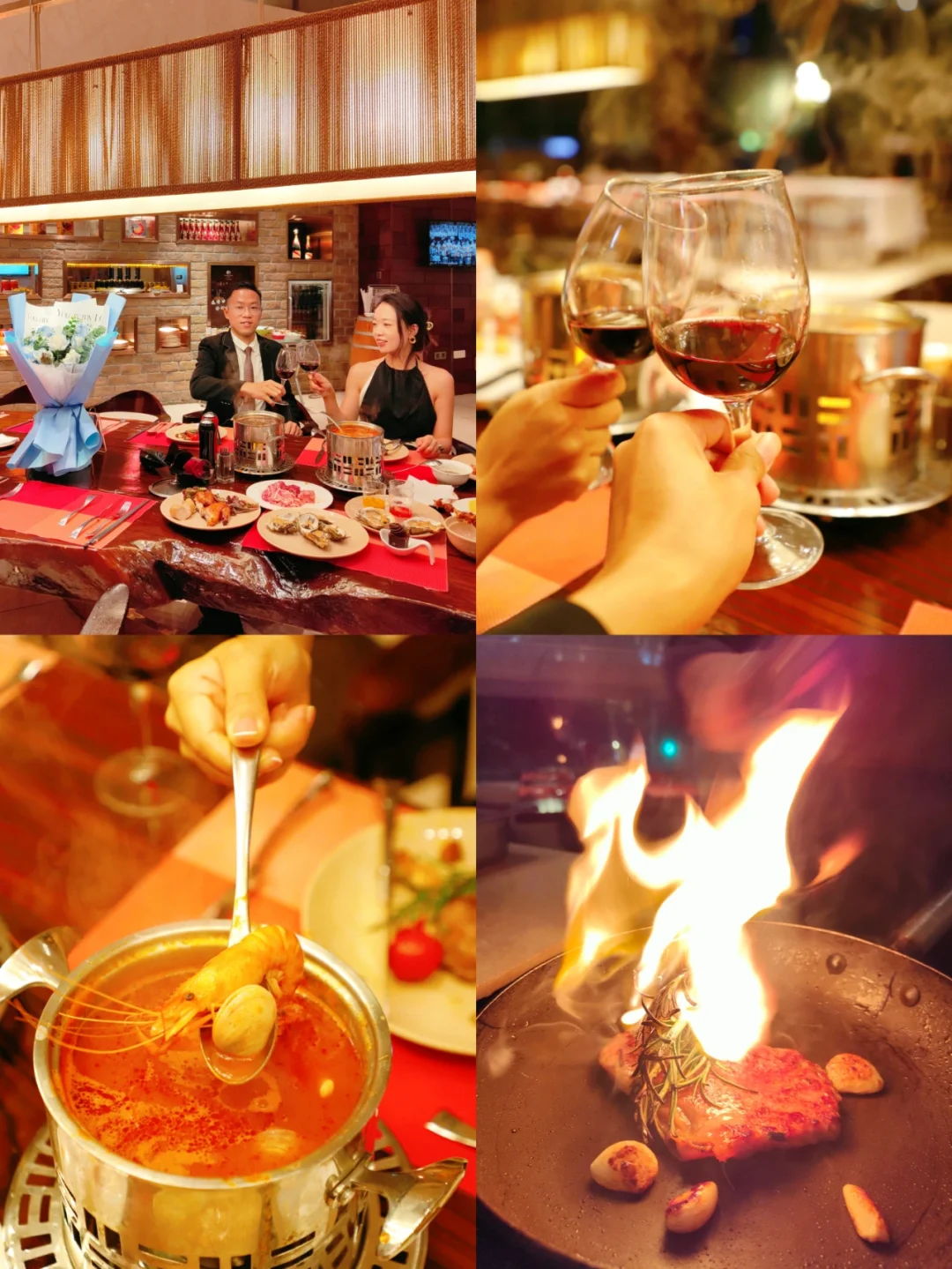 双人自助晚餐,餐厅依然是当年的高端大气,现在是有各类中西式美食,现场还有火焰牛扒,我们看到美食也变成一道风景了。另外要现捞海鲜,可以煮小火锅,甜品也是琳琅满目,满足我们的胃,也让我们感觉到现在生活的满足。