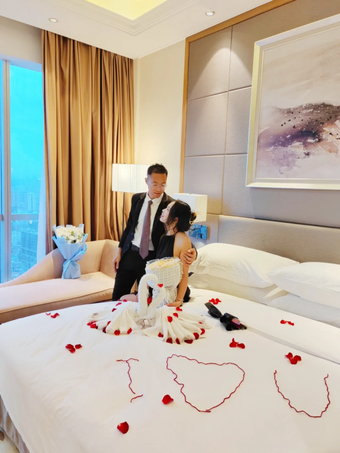 酒店客房布置,用花来烘托气氛最好不过了,强烈表达爱情的造型布置,象征炽热爱情的红玫瑰花,洗浴间也布置了花,然后是准备了一大束香槟色玫瑰,也是我当你跟叶太太求婚用的香槟色,复刻了一下当你求婚的回忆,因为香槟色玫瑰寓意:我只钟情你一人。它代表了自己的爱一心一意,一般只用来送给爱人的哦。