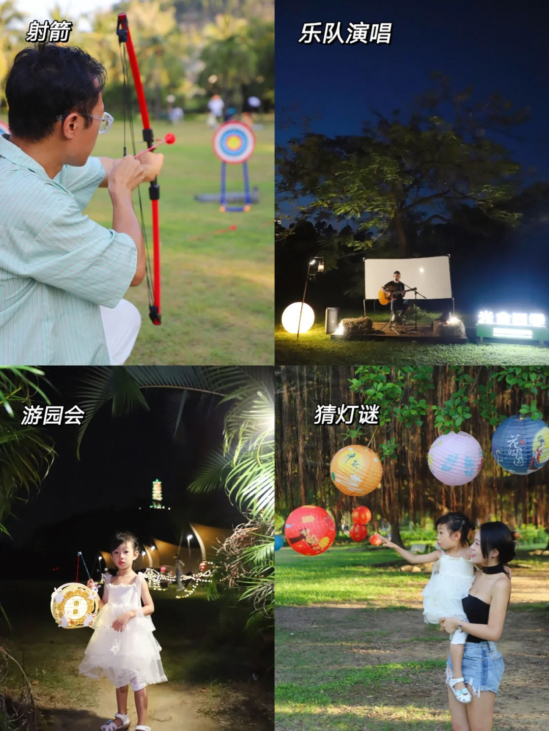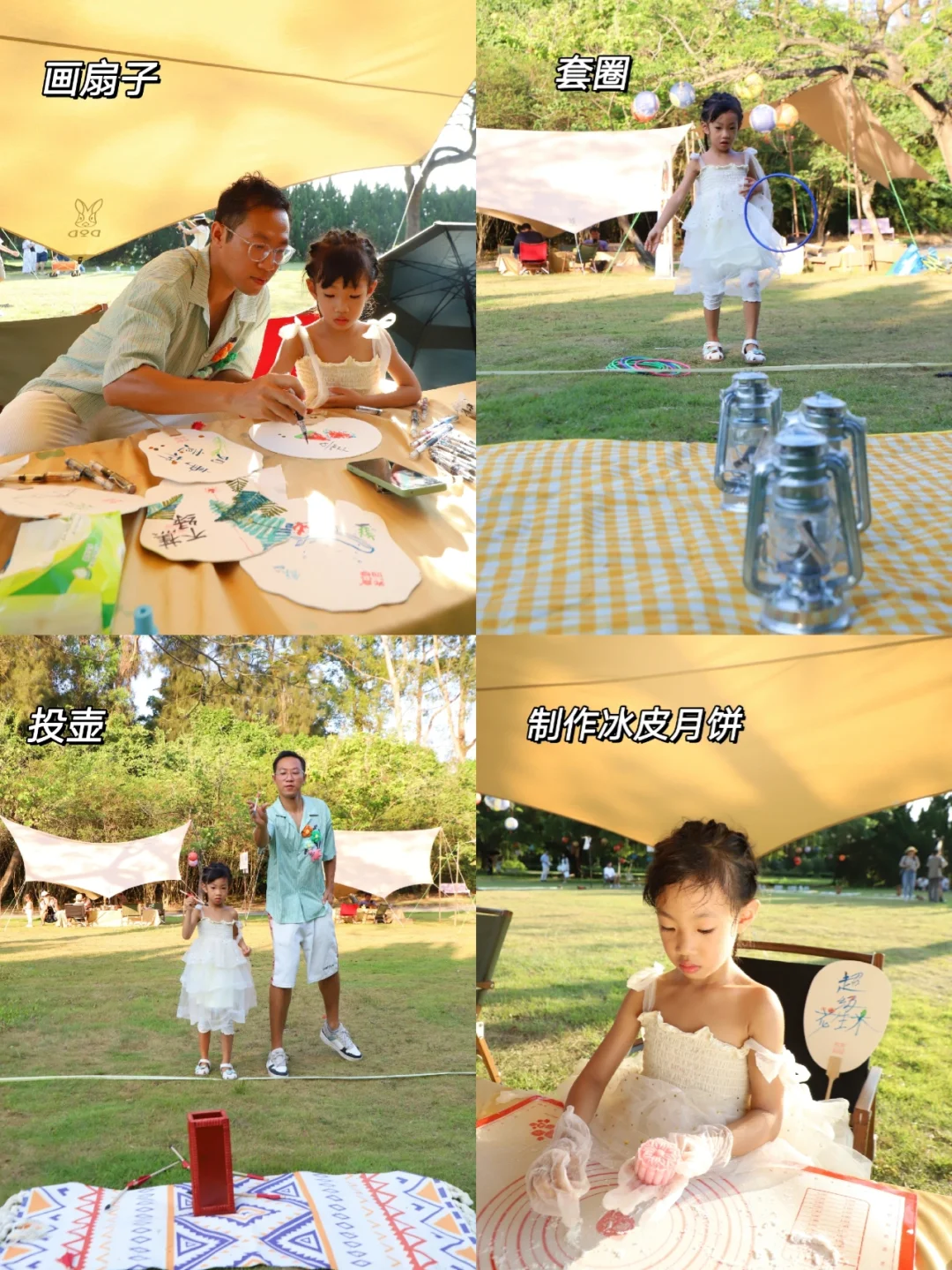 这次在露营地刚好遇到中秋游园会,亲子家庭可以感受多种游戏,有套圈,投壶,射箭,猜灯谜🏮,画扇子,还有DIY冰皮月饼🥮,我家花生米宝宝最近都上迷上了套圈圈,之前在市集就有玩,还有画扇子和做月饼都是她近期超喜欢的,做了草莓外皮的月饼,还有“喜乐平安”的扇子,很有意思。