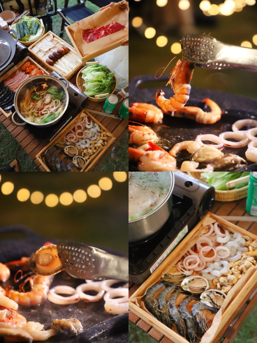 夜幕降临,现场音乐🎶🎶响起来,我们就开始吃自助烤肉晚餐啦,不仅有老虎虾,鲍鱼,还有鲜鱿鱼圈,蚌肉等等;另外还有寿喜锅,食材超丰富,跟海鲜一起荤素搭配很营养哦,而且还可以点上柠檬茶这些现做的饮品,服务也很到位哦,简直就是随叫随到,最后工作人员还怕我们找不到回去的路,特地送我们到停车口,这次体验感真的很棒。