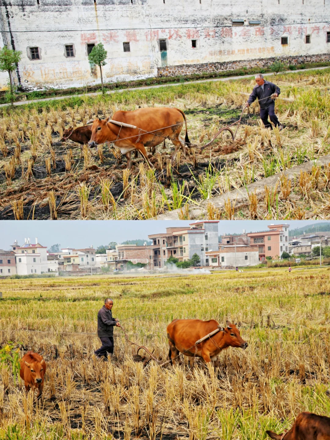 广东林寨秋后收割完,需要重新犁地,可以看到农垦的画面,还有一堆在田间玩耍嬉戏的画面,看起来就是简单的纯真快乐。