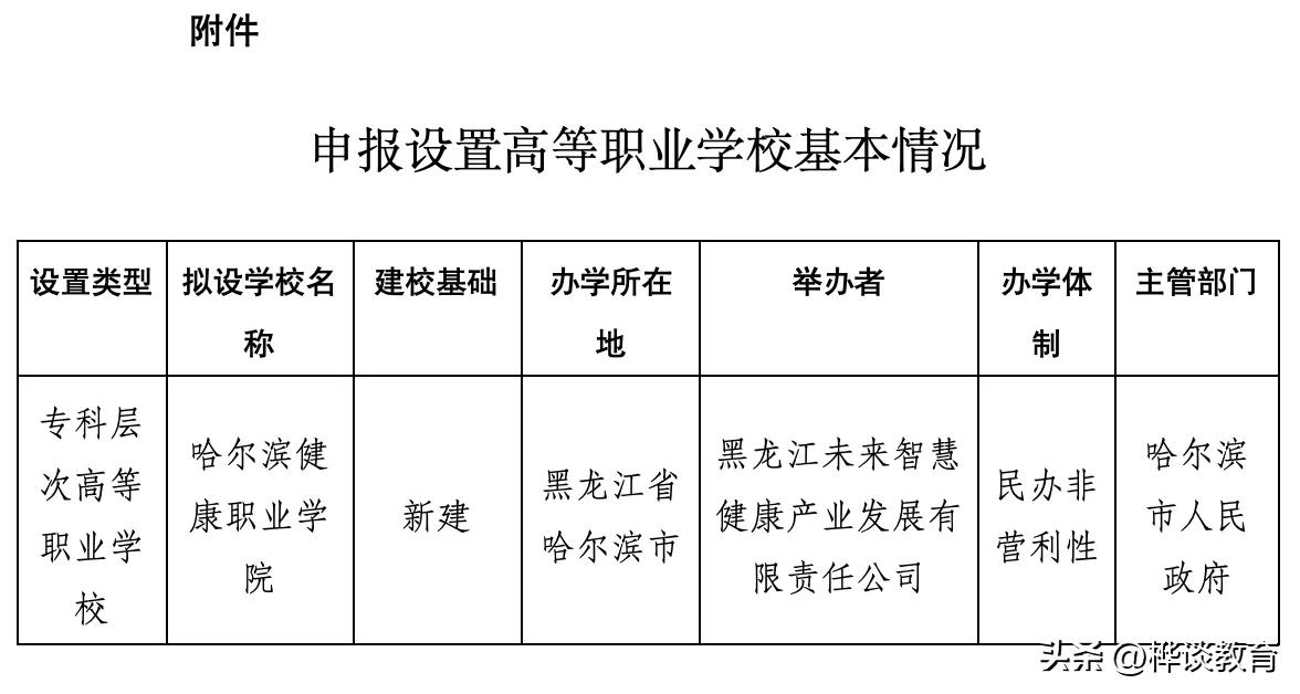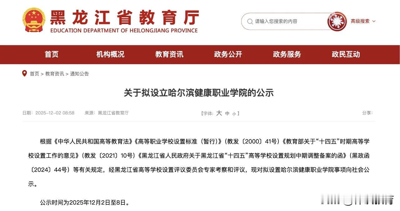 黑龙江省又将新增一所高校[庆祝][庆祝] 关于拟设立“哈尔滨健康职业学院”的公示: 根据《中华人民共和国高等教育法》《高等职业学校设置标准(暂行)》(教发〔2000〕41号)《教育部关于“十四五”时期高等学校设置工作的意见》(教发〔2021〕10号)《黑龙江省人民政府关于黑龙江省“十四五”高等学校设置规划中期调整备案的函》(黑政函〔2024〕44号)等有关规定,经黑龙江省高等学校设置评议委员会专家考察和评议,现对拟设置“哈尔滨健康职业学院”事项向社会公示。 公示时间为2025年12月2日至8日。