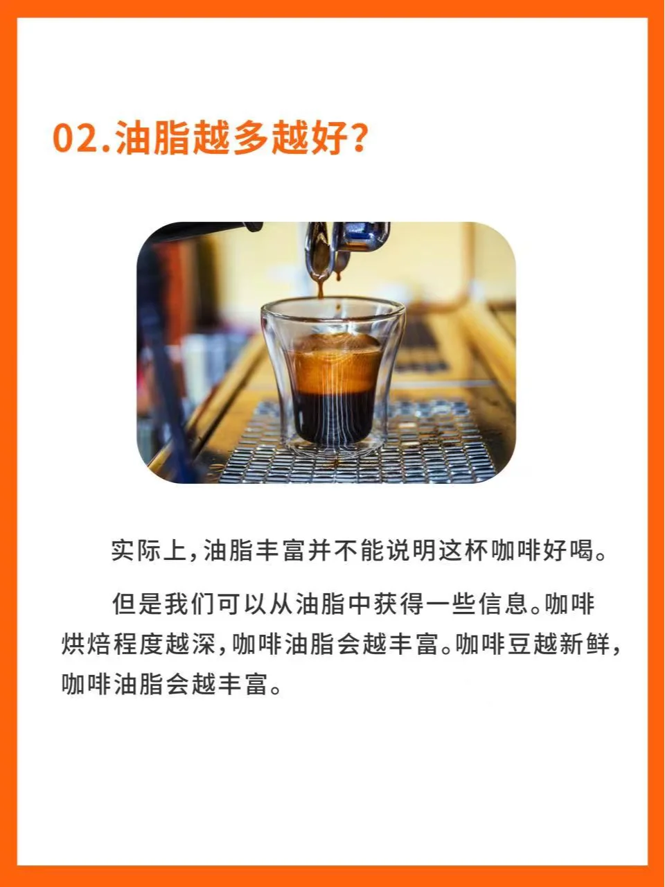 实际上,油脂丰富并不能说明这杯咖啡好喝。但是我们可以从油脂中获得一些信息。咖啡烘焙程度越深,咖啡油脂会越丰富。咖啡豆越新鲜咖啡油脂会越丰富。