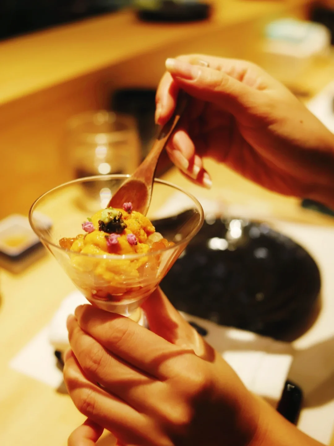 白虾海胆杯:白虾很细很新鲜,海胆在铺在上面的,没有腥味,适合慢慢品尝。