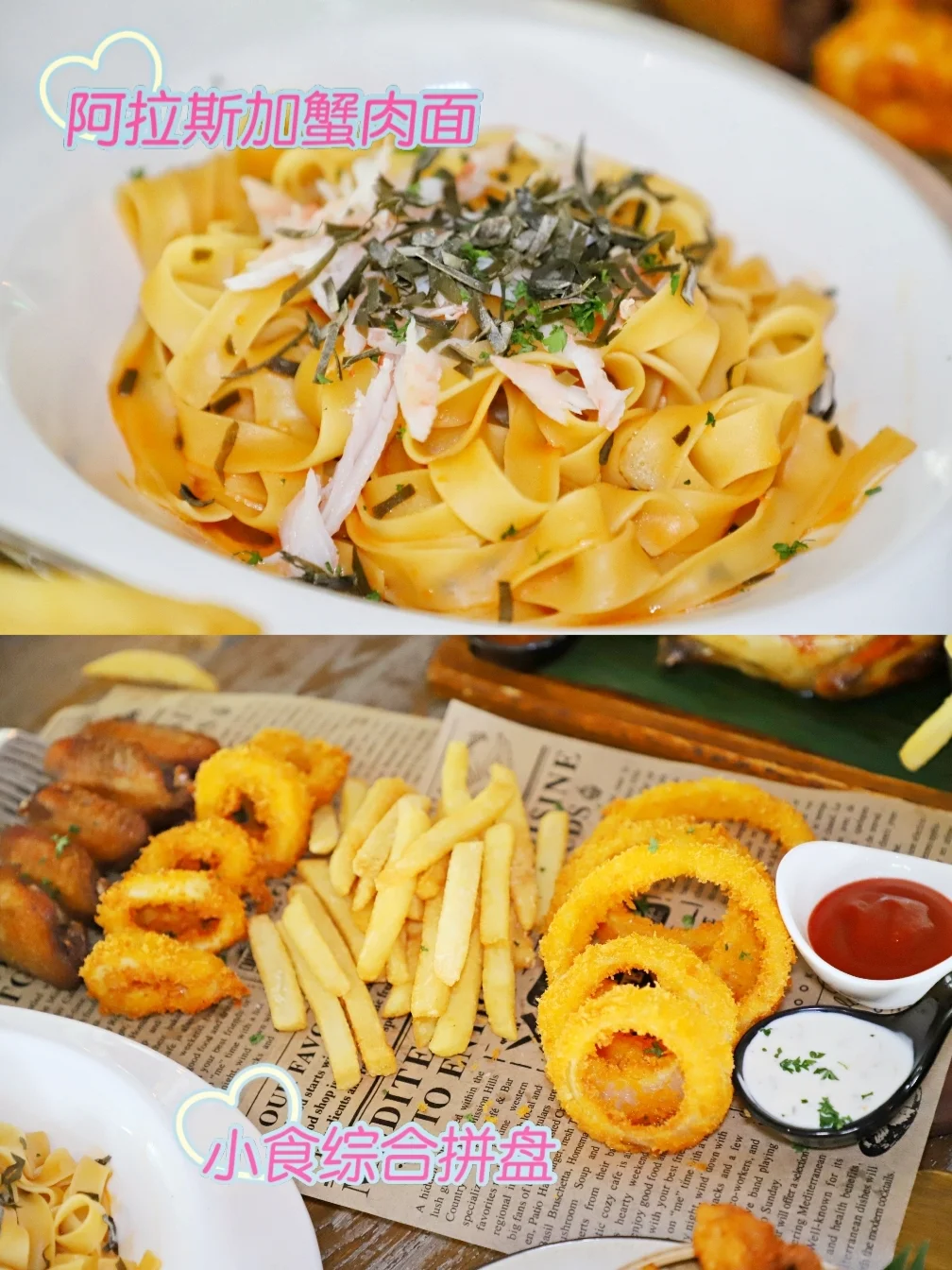 【小食综合拼盘】包含洋葱卷、薯条、鱿鱼卷和鸡翅,大饱口福