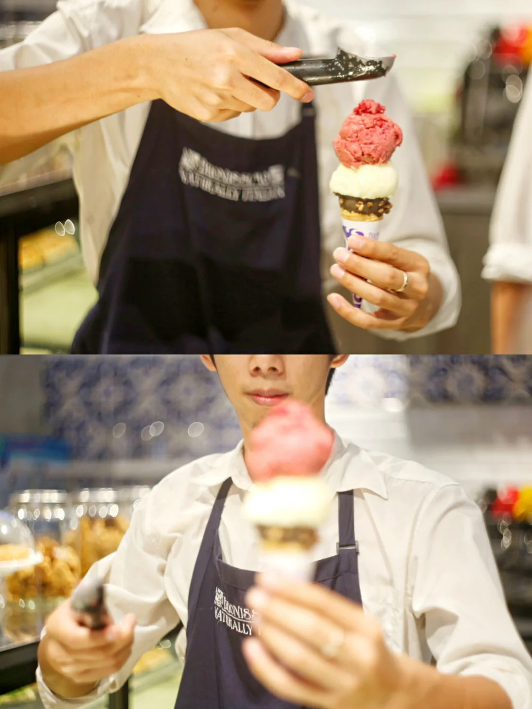 等咖啡好的时间,当然是先来一个意式冰淇淋了,多达20个不同口味,而且冰淇淋筒装有三款可选,最有的颜值的是巧克力花生米粒酱。