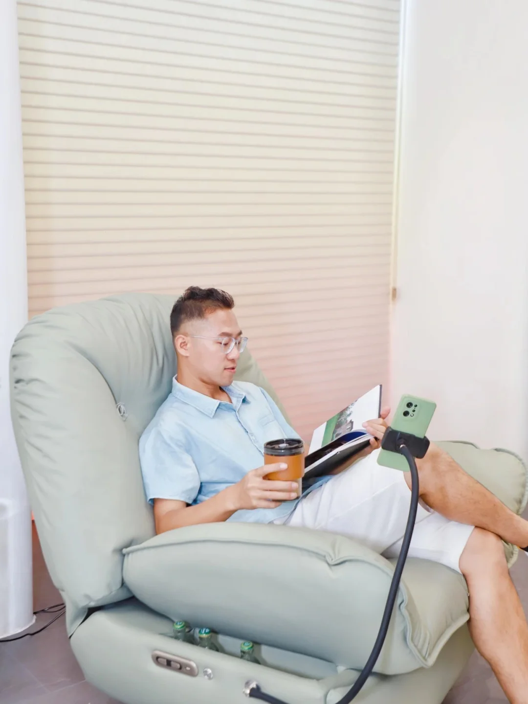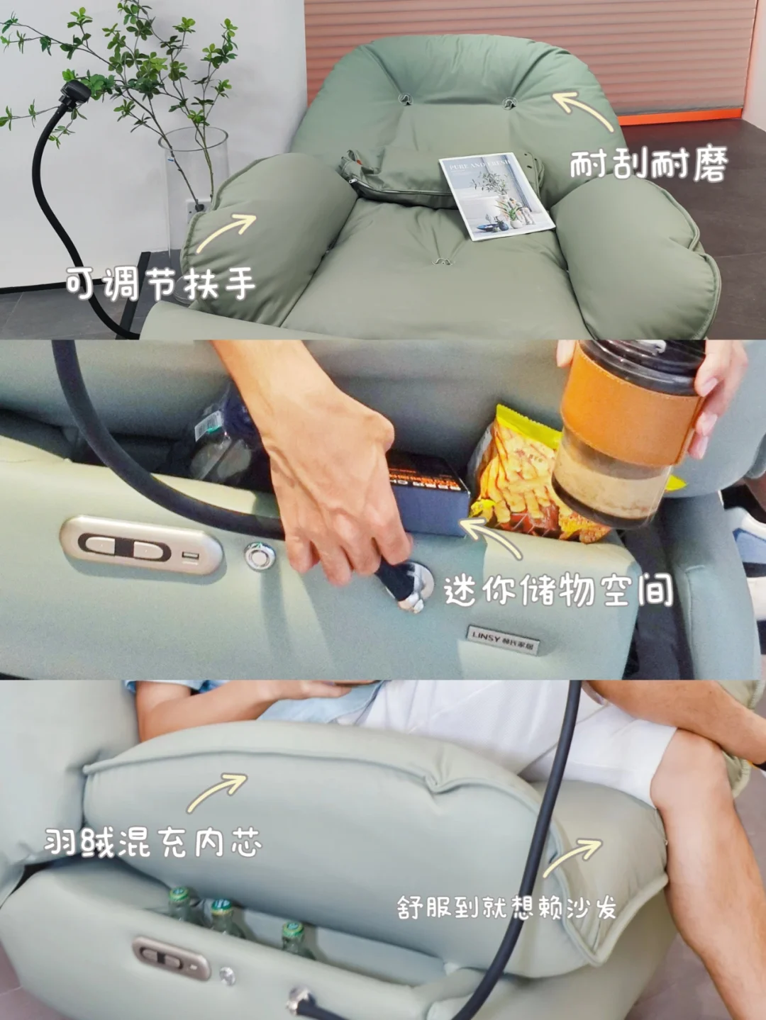 这款沙发还有人性化设计,双扶手储物箱就在沙发侧面,🍟放零食饮料🥤还有小物件都非常方便,追剧零食两不误📺,USB充电口,让你看剧不断电,360度可旋转手机支架, 解放双手就这么粗暴简单。