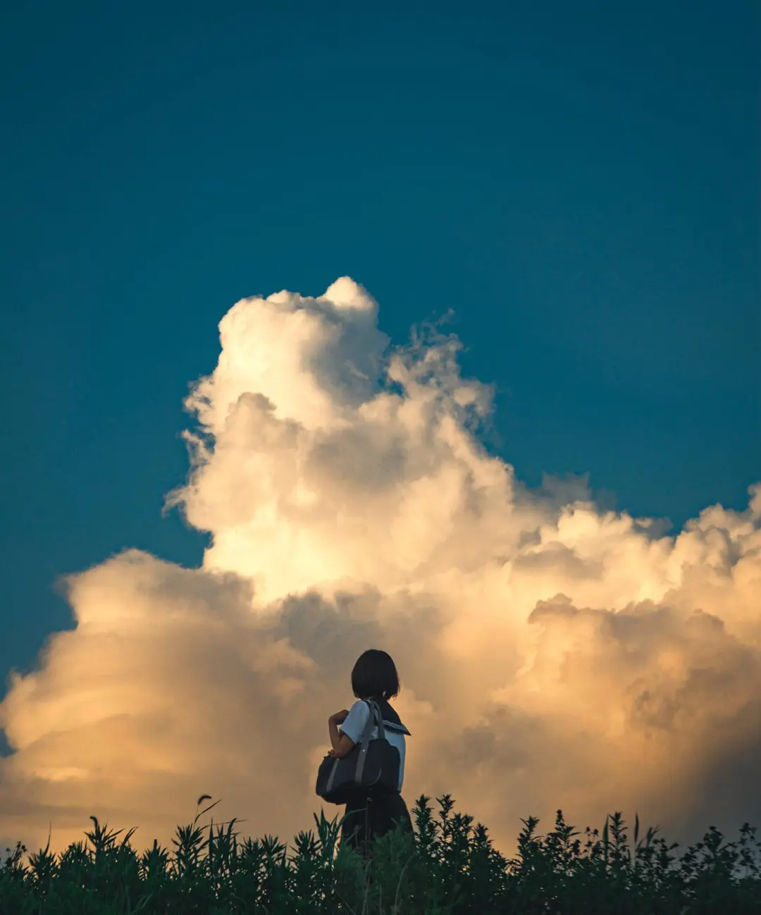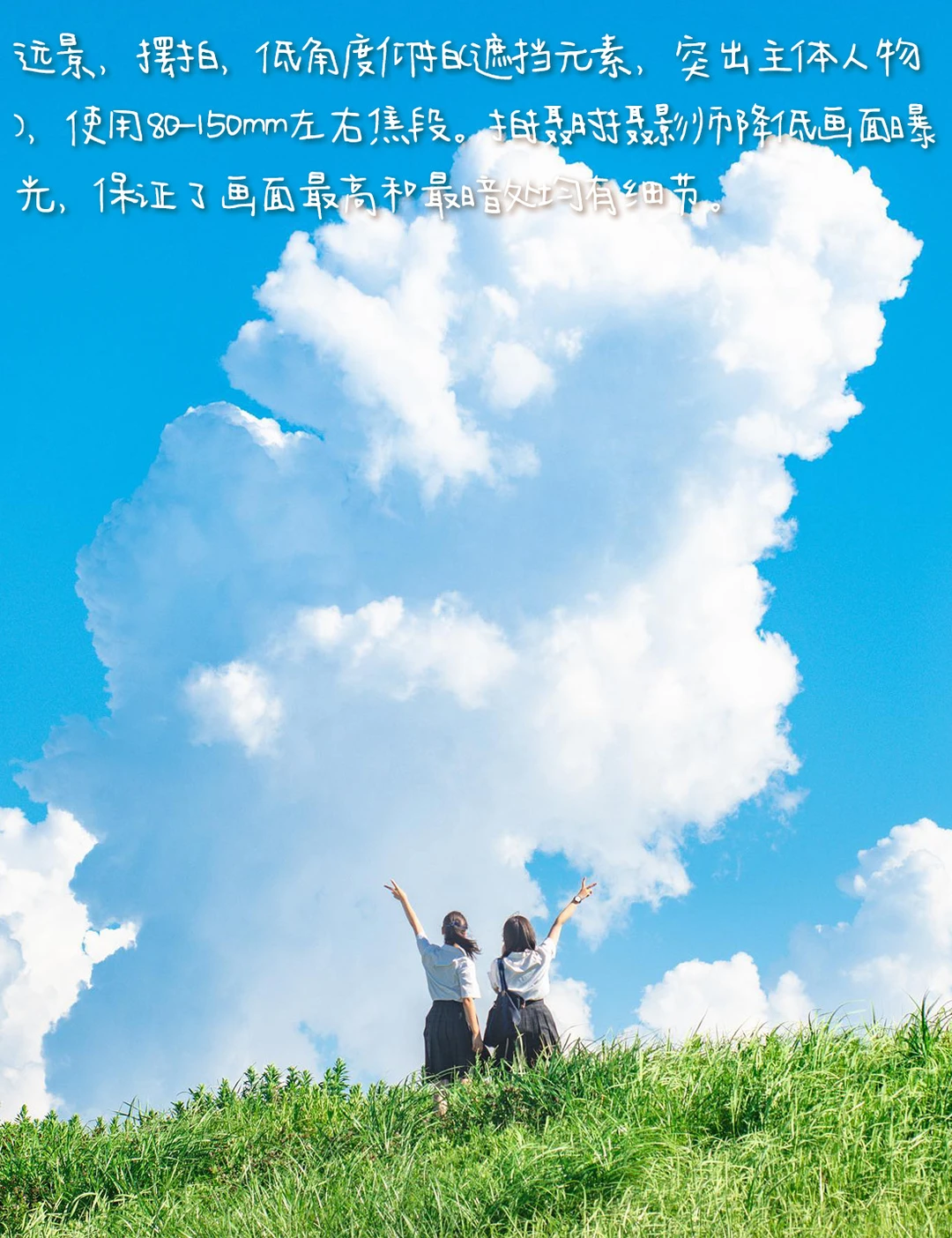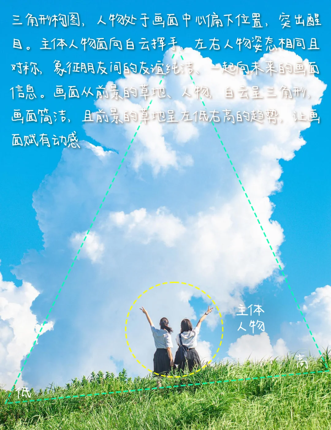 1.构图:三角形构图,人物处于画面中心偏下位置,突出醒目。主体人物面向白云挥手,左右人物姿态相同且对称,象征朋友间的友谊纯洁、牢固,一起向未来的画面信息。画面从前景的草地、人物,白云呈三角形,画面简洁,且前景的草地呈左低右高的趋势,让画面赋有动感。