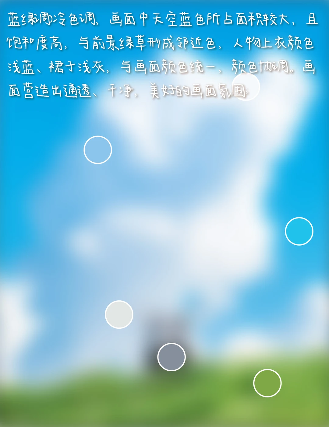 4.色调:(蓝绿调)冷色调,画面中天空蓝色所占面积较大,且饱和度高,与前景绿草形成邻近色,人物上衣颜色浅蓝、裙子浅灰,与画面颜色统一,颜色协调。画面营造出通透、干净,美好的画面氛围;