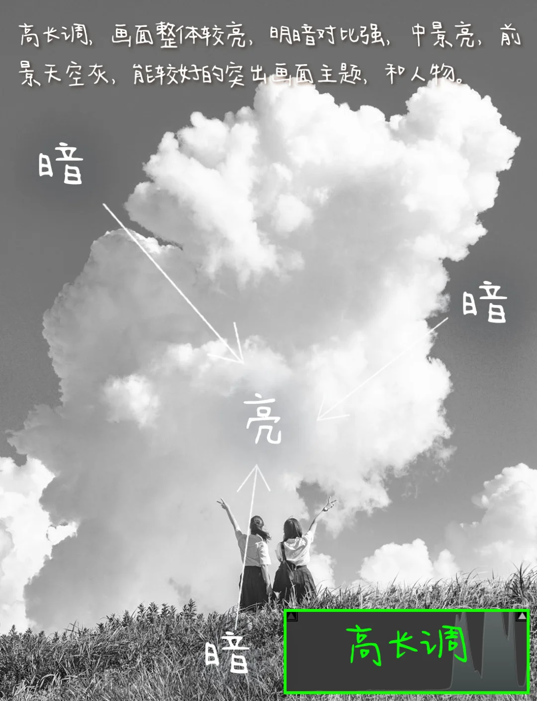 3.影调:高长调,画面整体较亮,明暗对比强,中景亮,前景天空灰,能较好的突出画面主题,和人物。