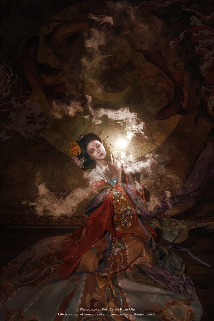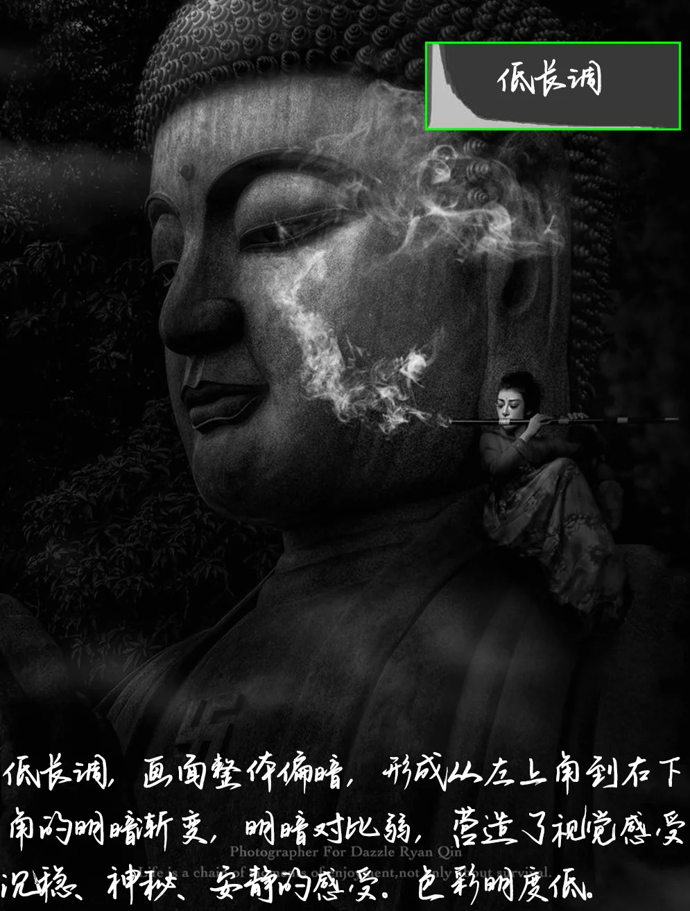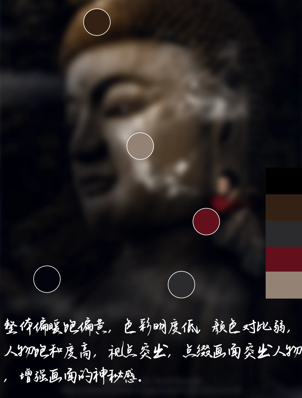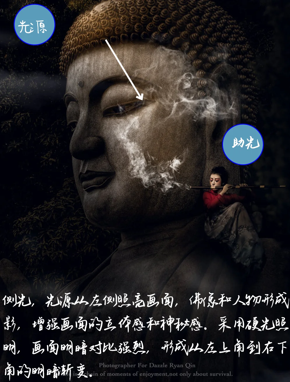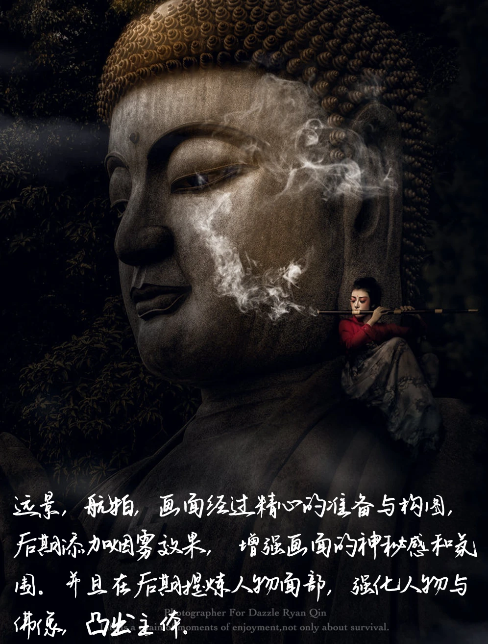 5. 拍摄:远景,航拍,画面经过精心的准备与构图,后期添加烟雾效果, 增强画面的神秘感和氛围。并且在后期提炼人物面部,强化人物与佛像,凸出主体。