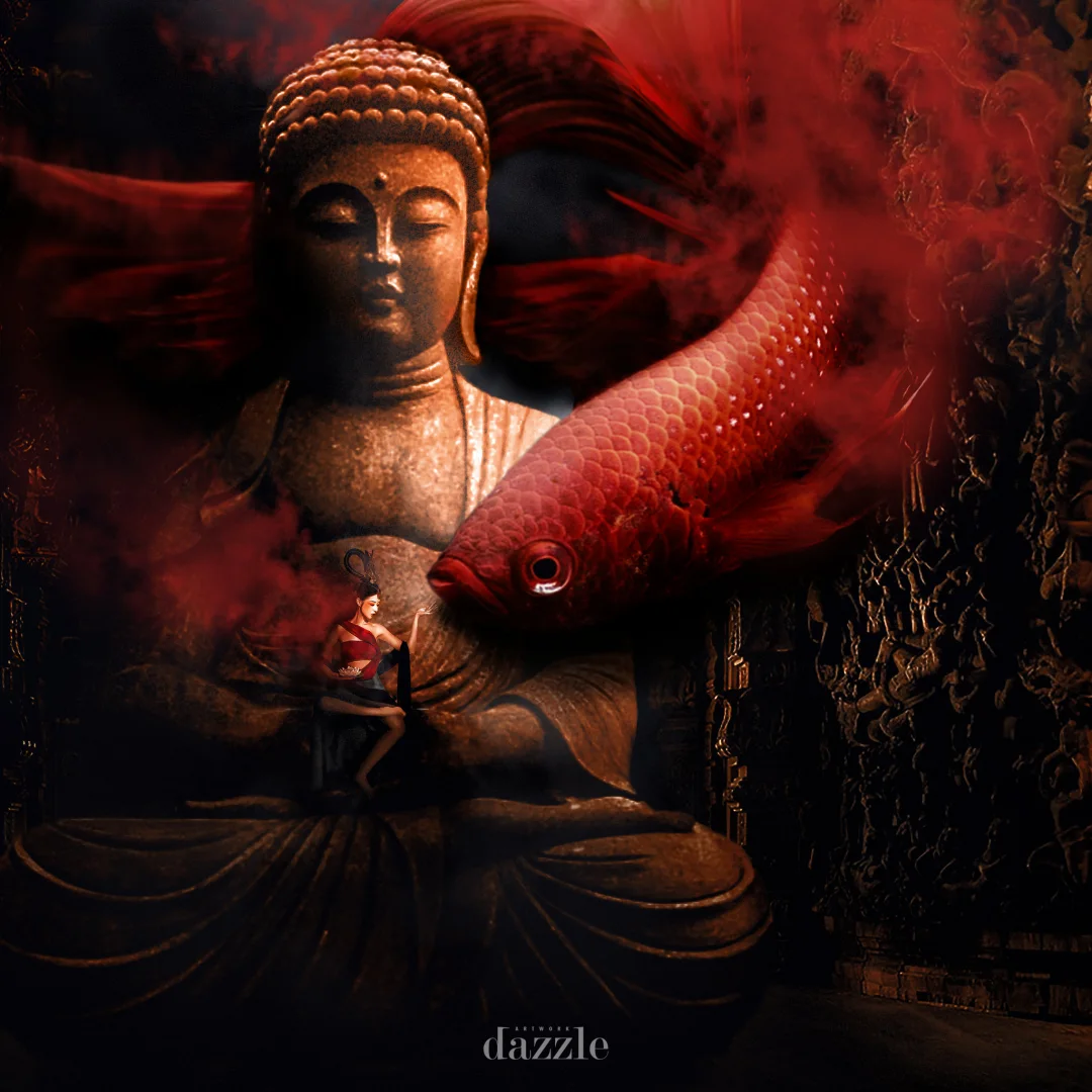 2. 光线:侧光:侧光光源从左侧照亮画面,佛像和人物形成剪影,增强画面的立体感和神秘感。采用硬光照明,画面明暗对比强烈,形成从左上角到右下角的明暗渐变。