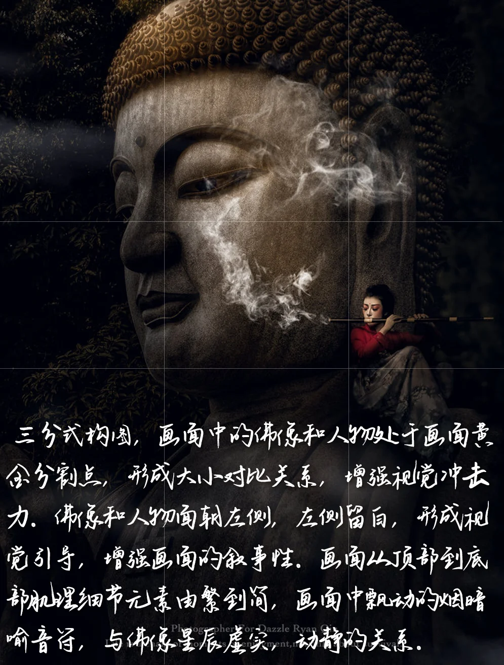 1. 构图:三分式构图,画面中的佛像和人物处于画面黄金分割点,形成大小对比关系,增强视觉冲击力。佛像和人物面朝左侧,左侧留白,形成视觉引导,增强画面的叙事性。画面从顶部到底部肌理细节元素由繁到简,画面中飘动的烟暗喻音符,与佛像星辰虚实,动静的关系。