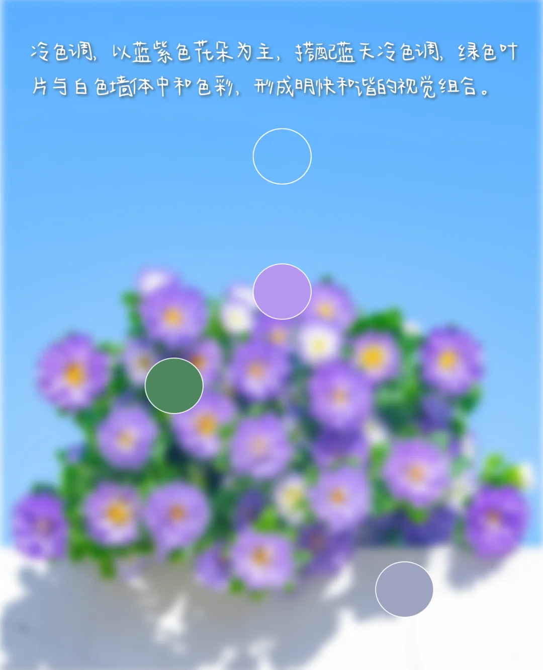 4.色调:冷色调,以蓝紫色花朵为主,搭配蓝天冷色调,绿色叶片与白色墙体中和色彩,形成明快和谐的视觉组合。