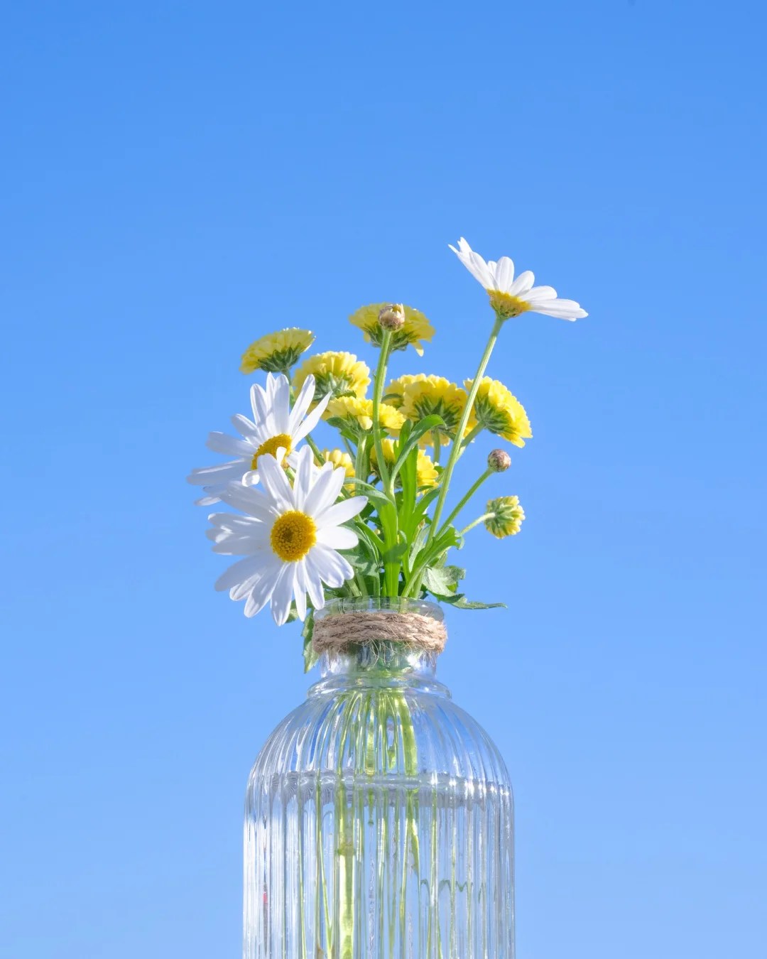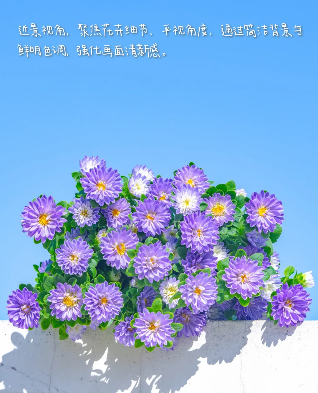 5.拍摄:近景视角,聚焦花卉细节,平视角度,通过简洁背景与鲜明色调,强化画面清新感。
