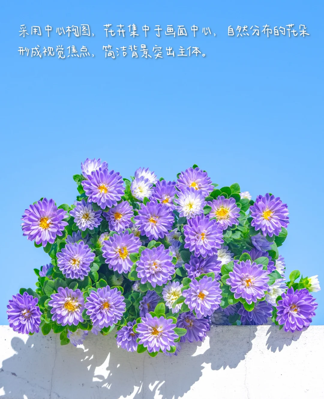 1.构图:采用中心构图,花卉集中于画面中心,自然分布的花朵形成视觉焦点,简洁背景突出主体。
