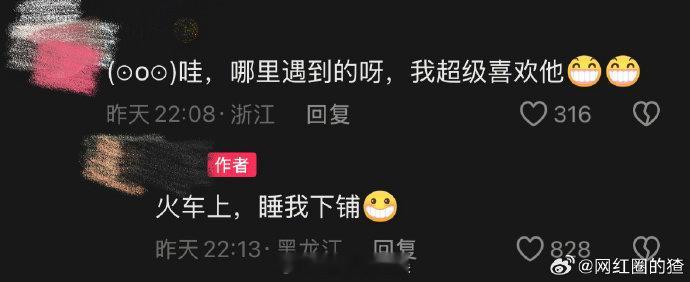 睡在我下铺的霸总绿皮火车上偶遇刘萧旭 网友发文称在绿皮火车上偶遇了短剧演员刘萧旭,就睡在自己下铺,评论区问和霸总一起睡觉啥感觉?网友回复:不敢轻易上下楼,怕踩到他