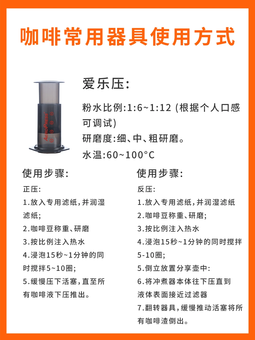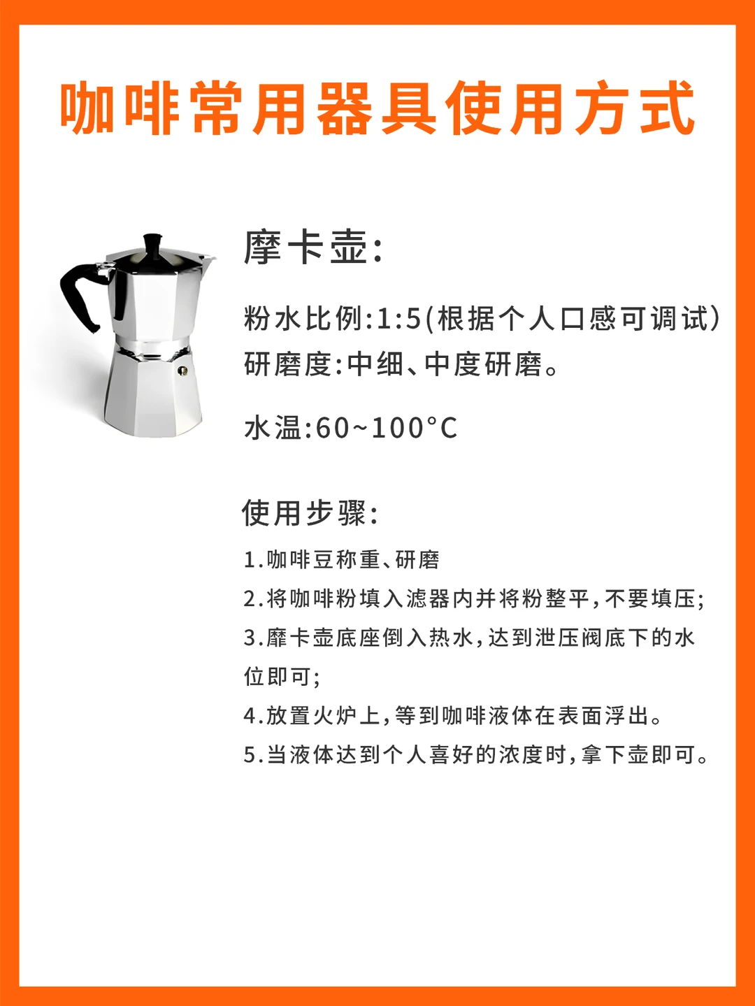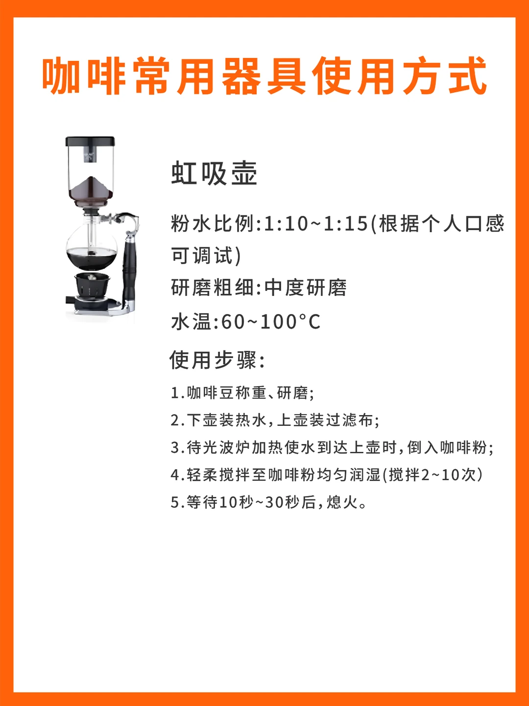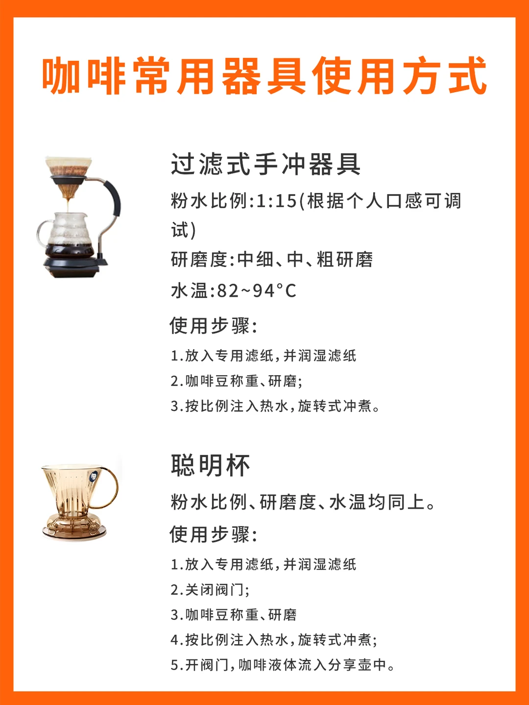 冲煮咖啡有很多种方式,可供使用的器具也数不胜数,那么,你了解的都有哪些呢? - 今天的【干货分享】是:常见的5种咖啡器具的使用方式。 - ✓ 爱乐压 ✓ 摩卡壶 ✓ 虹吸壶 ✓ 手冲器具 ✓ 聪明杯 - 新手可参考这些使用方式,做出美味的咖啡喔~