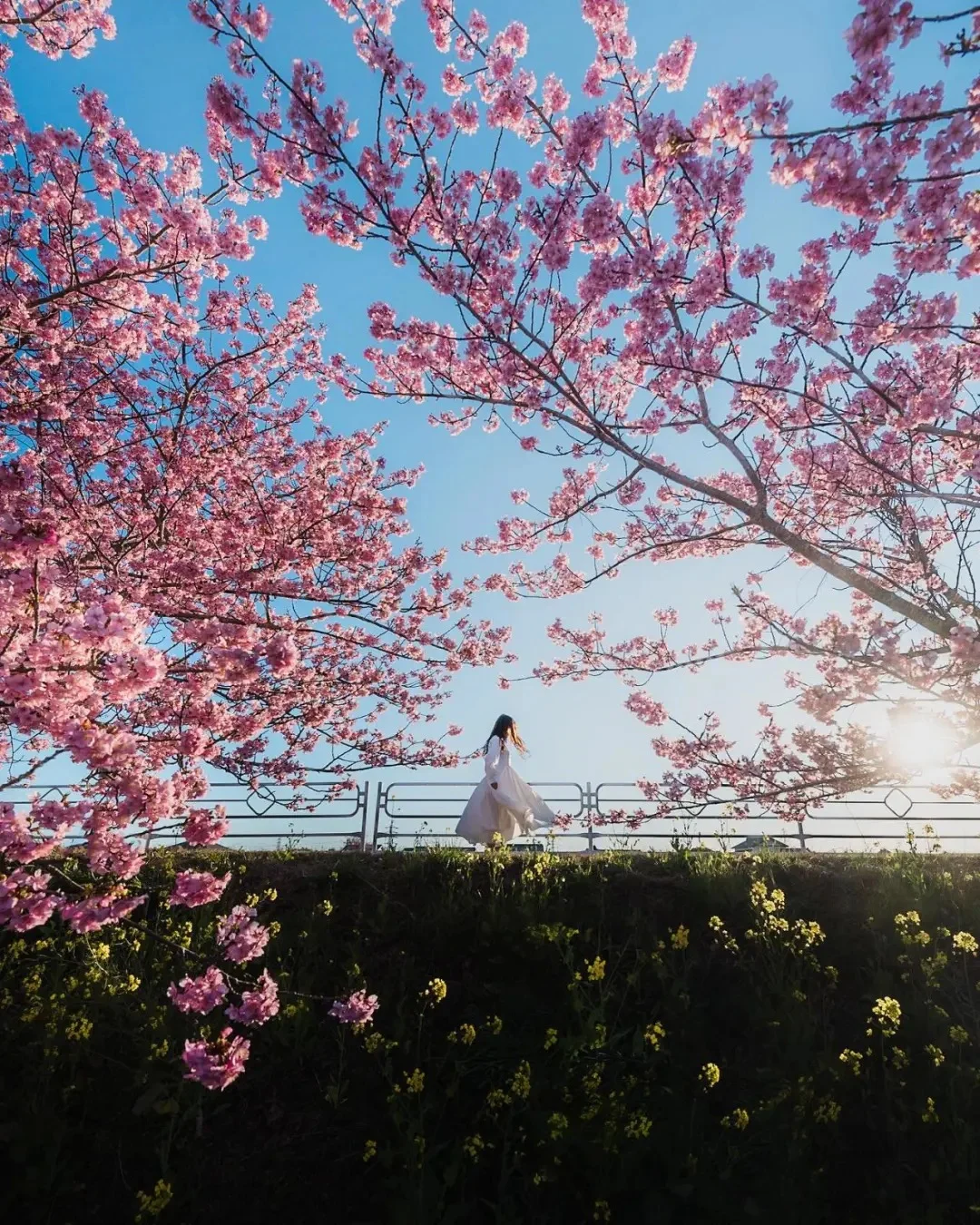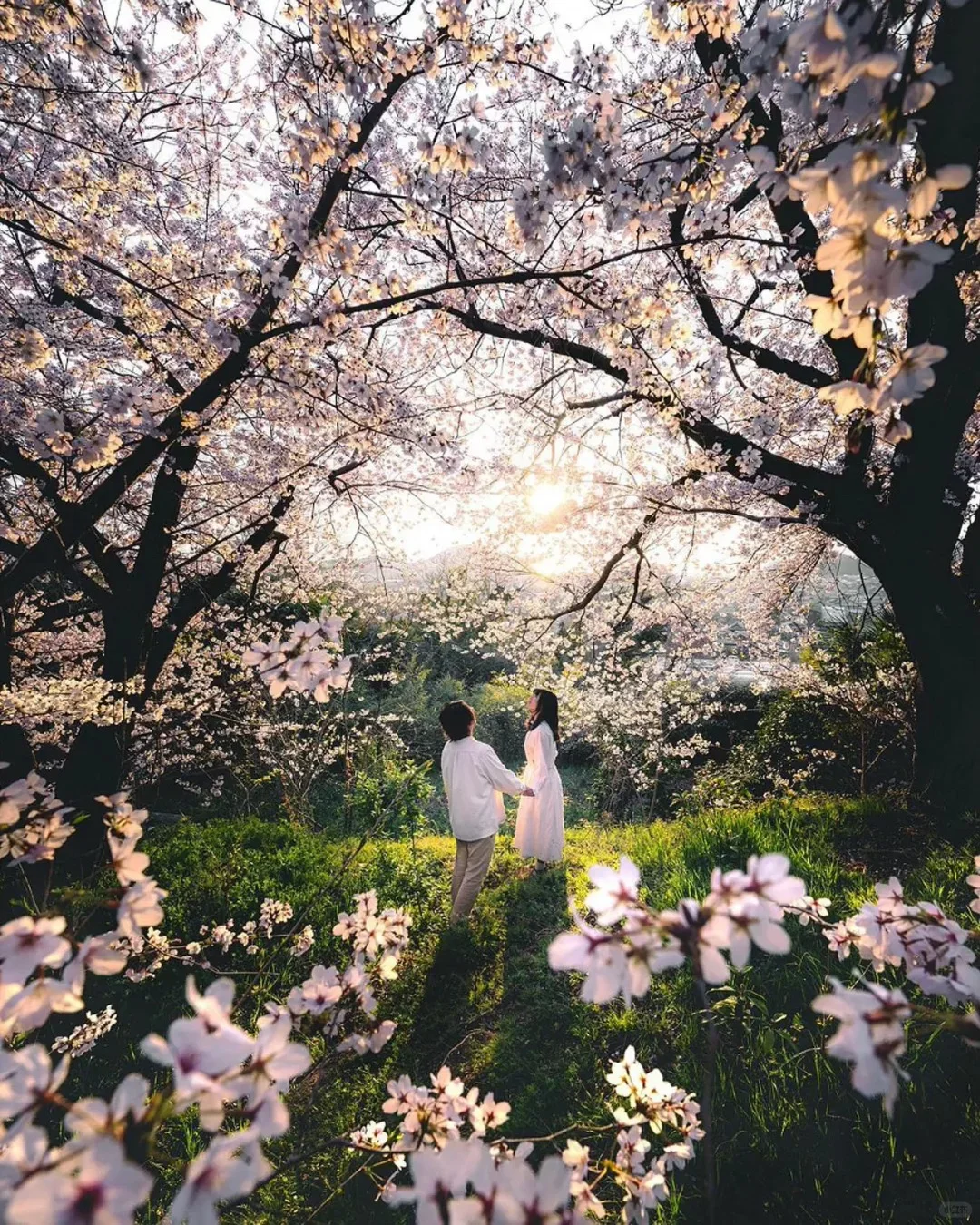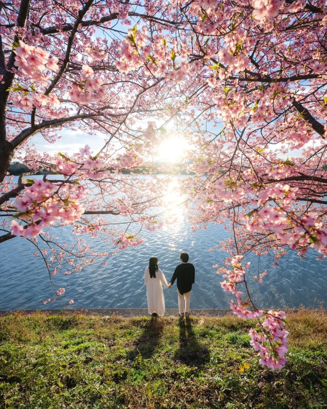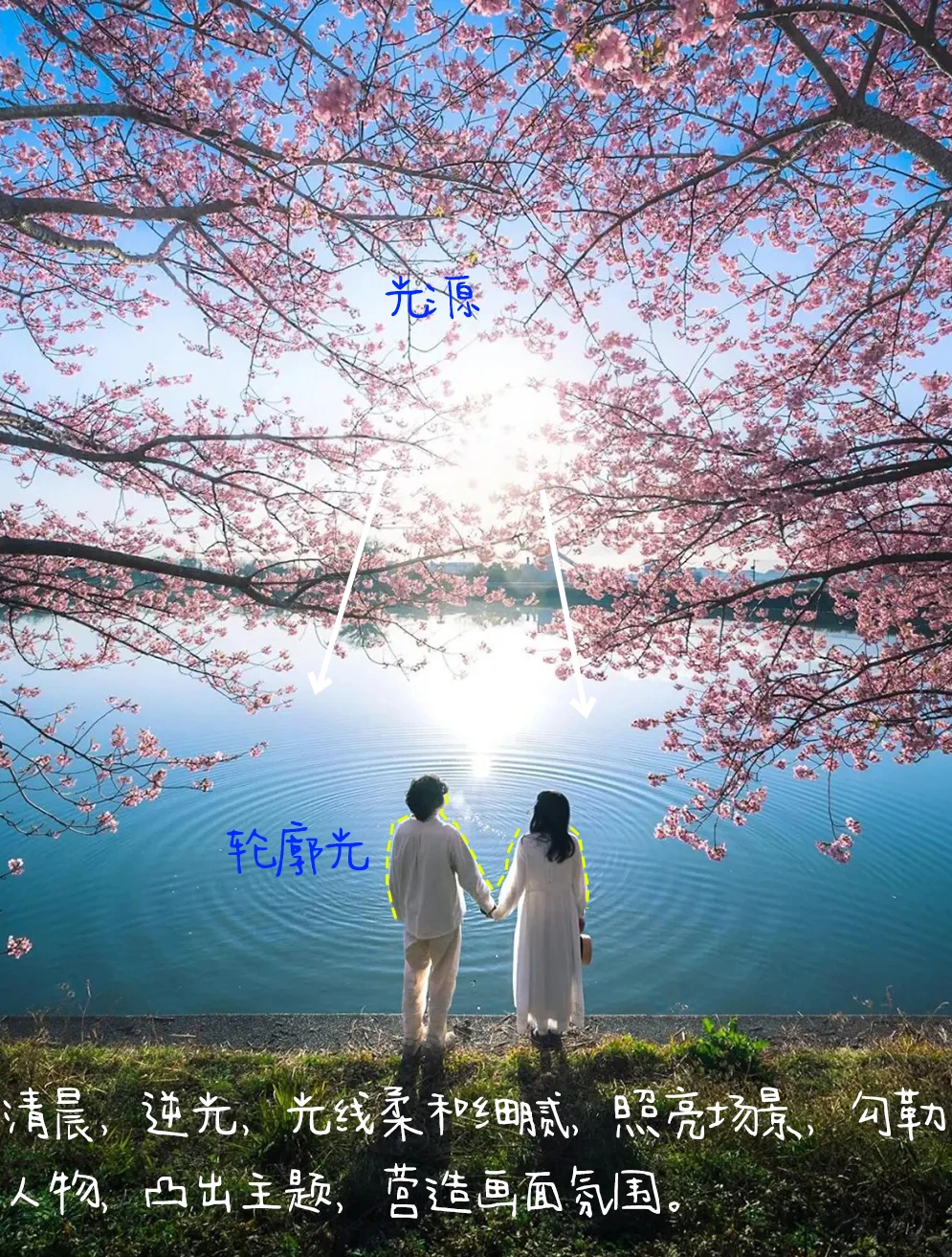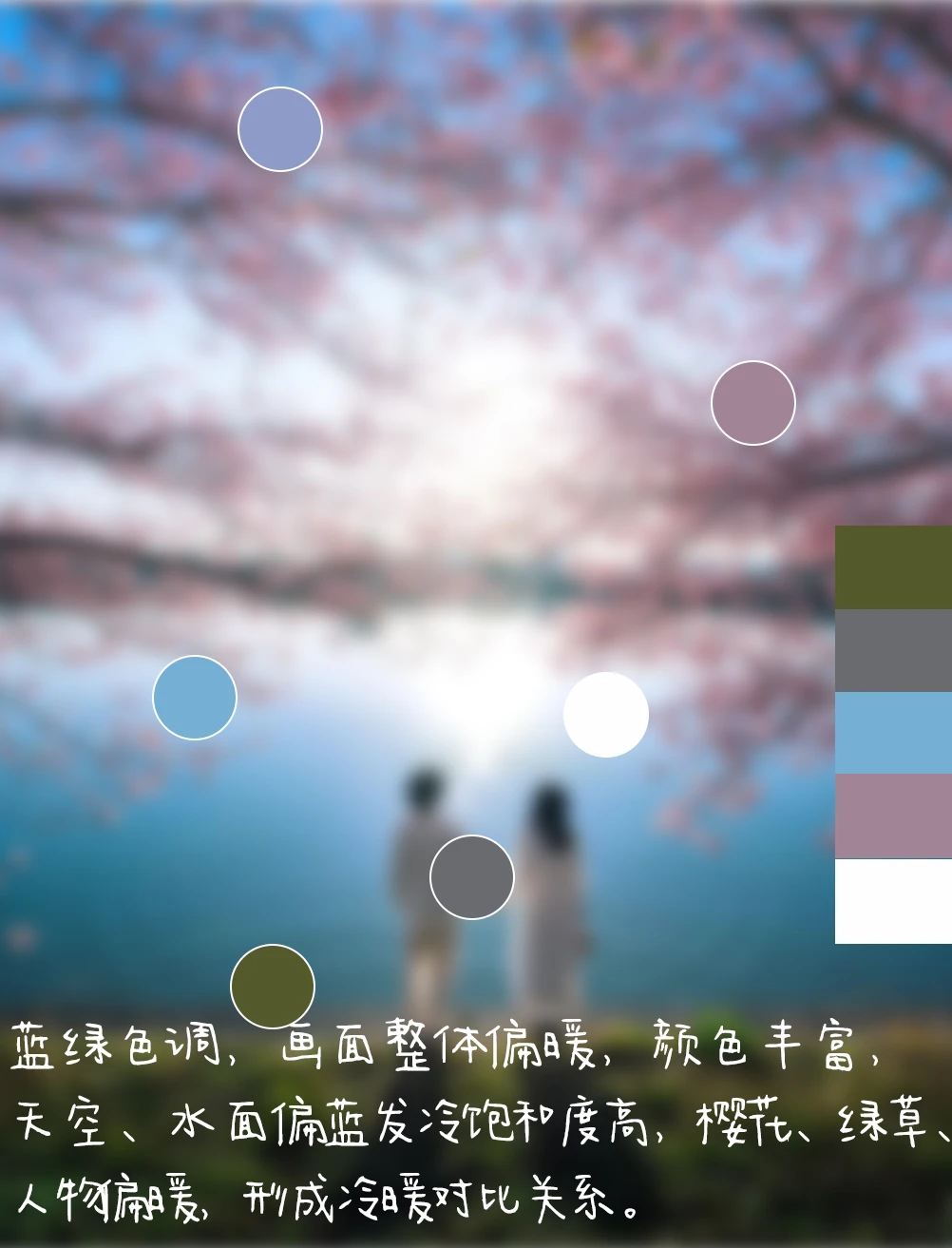 4.色调:蓝绿色调,画面整体偏暖,颜色丰富,天空、水面偏蓝发冷饱和度高,樱花、绿草、人物偏暖,形成冷暖对比关系。