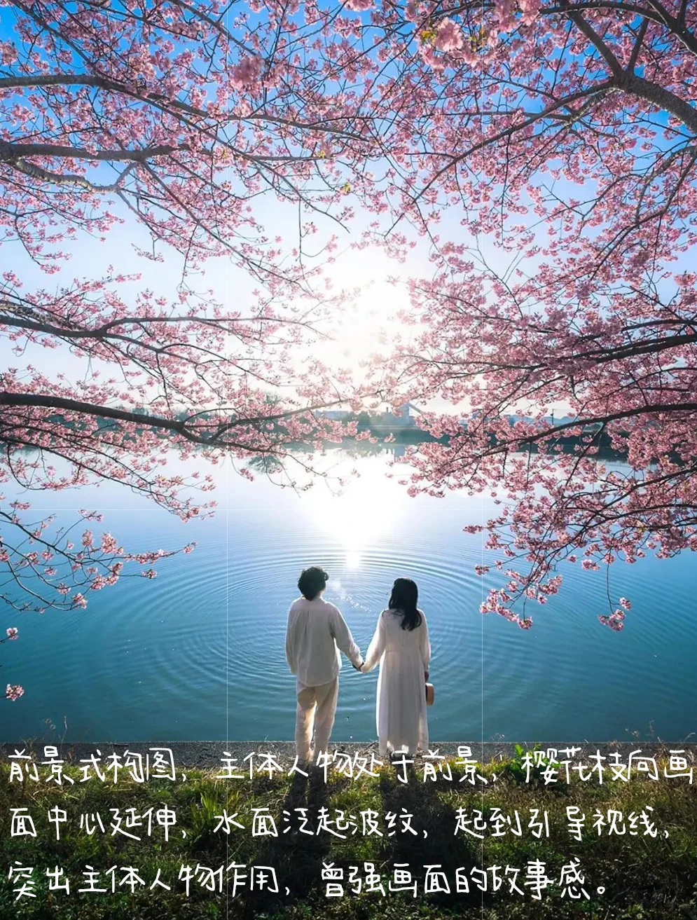 1.构图:前景式构图,主体人物处于前景,樱花枝向画面中心延伸,水面泛起波纹,起到引导视线,突出主体人物作用,曾强画面的故事感。