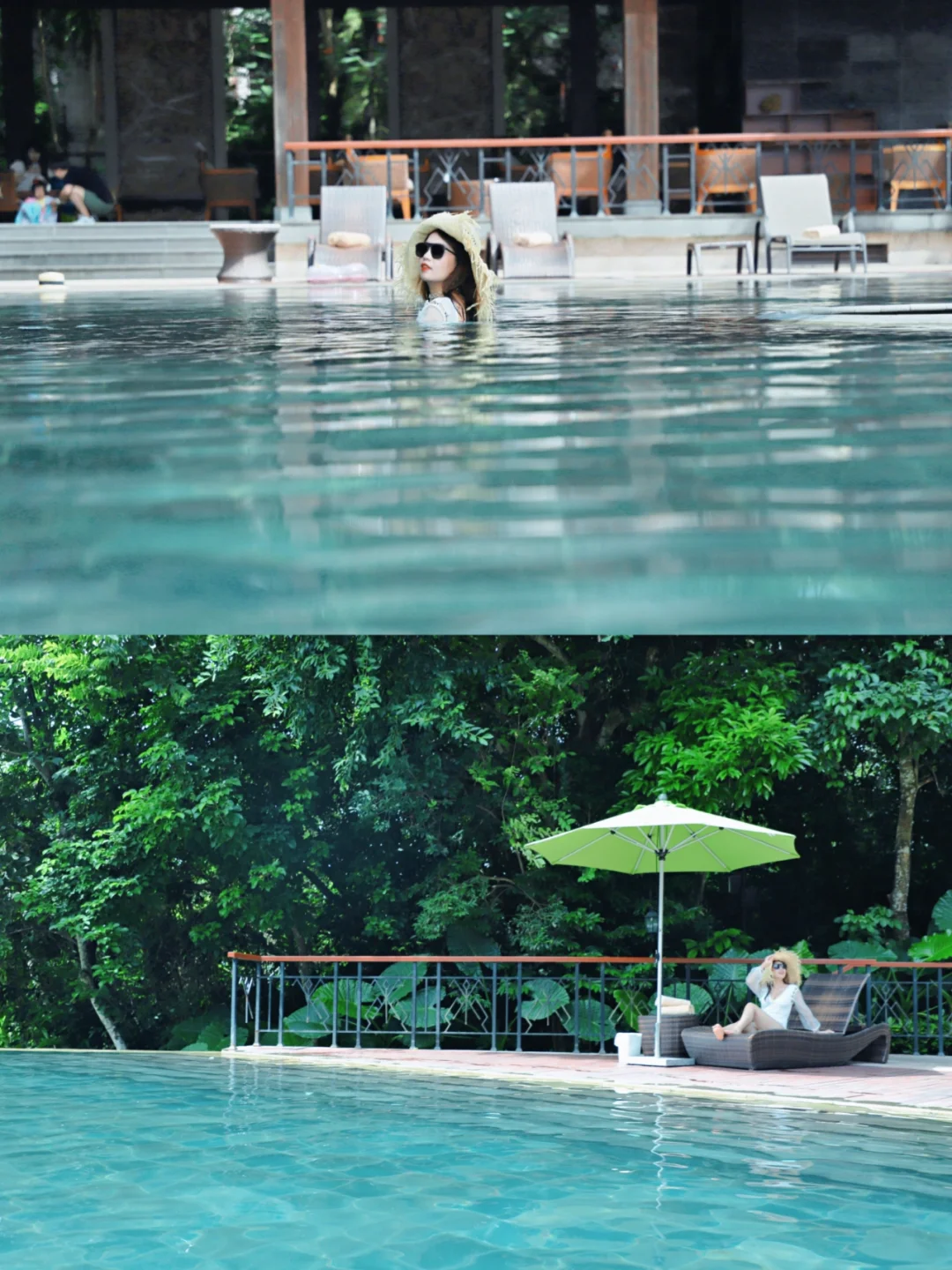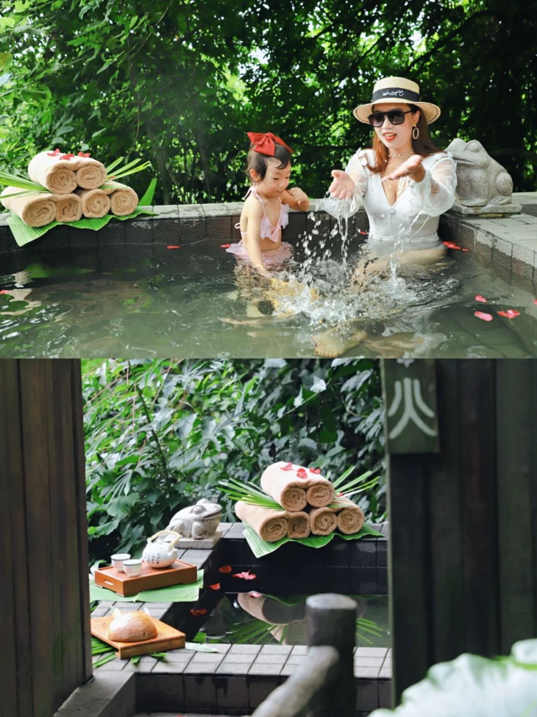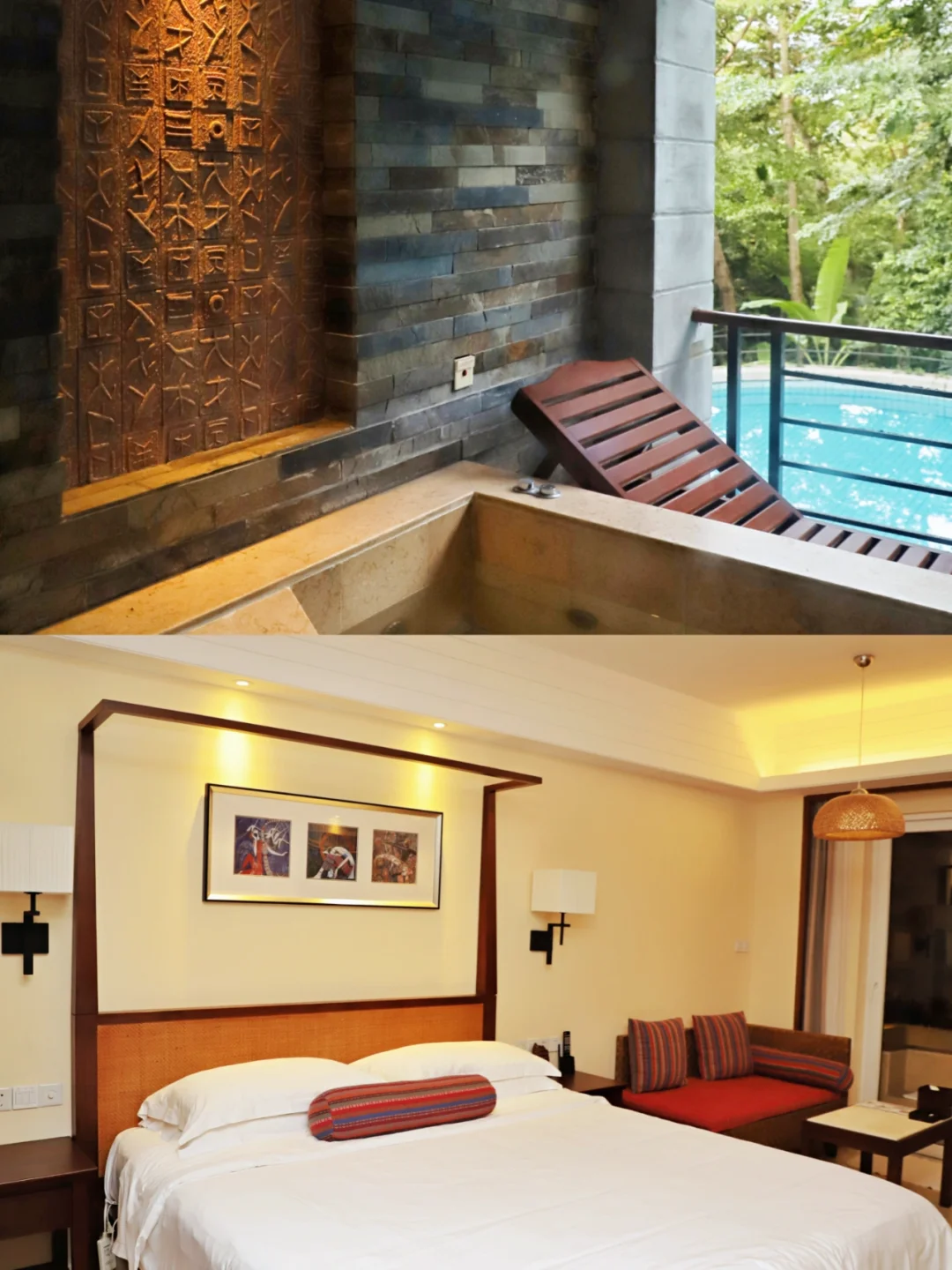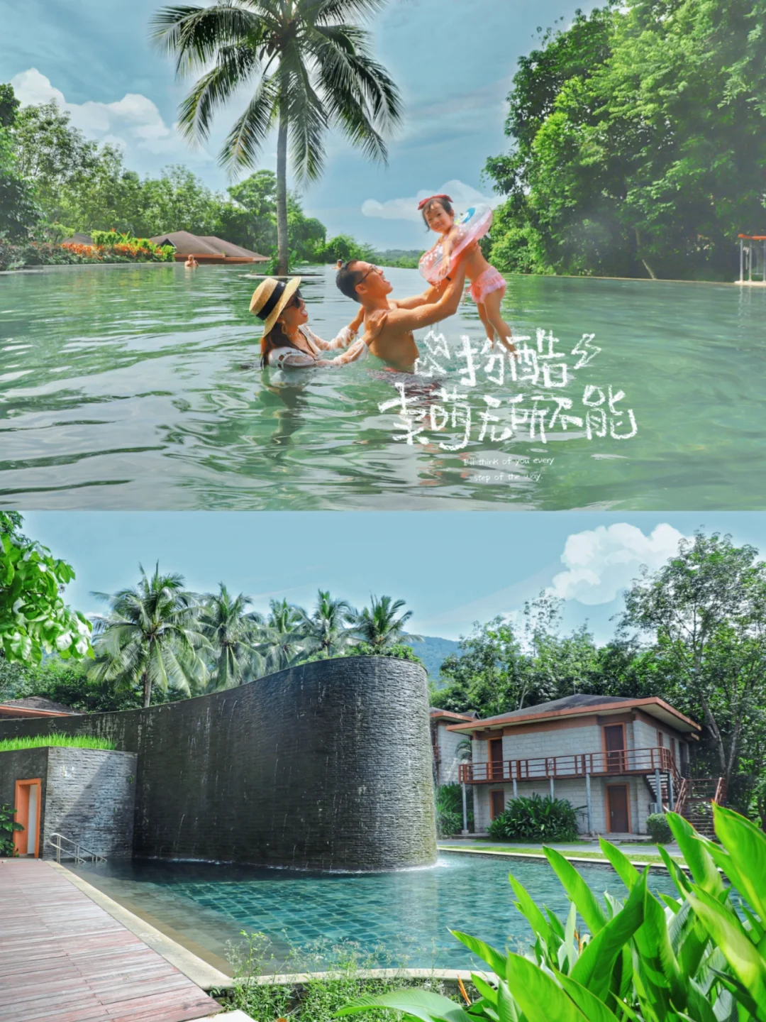 喜欢迎宾饮料木蝴蝶和鹧鸪茶,融入了海南本土特色,雨林别墅设计别出心裁,我们是住在香樟树下,拥有私家温泉池,开门就能看到泳池,宝宝第一次享受温泉澡,画面太美就不公开了😁