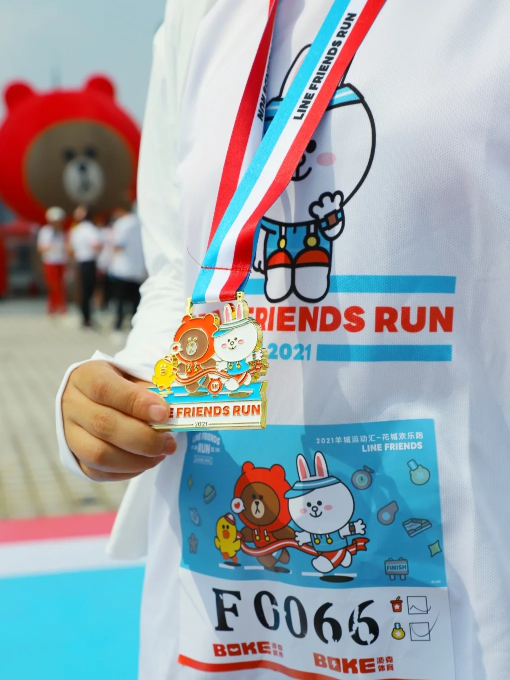 现场超多LINEFRIENDS元素,我们参赛的还有广州站SALLY形象特别限定萌趣赛事包,里面包含了广州站特别限定空顶帽,发带,护腕,水印贴,超萌的完赛奖牌,帽子,手腕带,贴纸等各种周边,完全沉浸在LINE FRIENDS的世界里,这一天户外录的高温35度,所以跑出来的都是热情和快乐,一起跑起来,一起体验精彩!