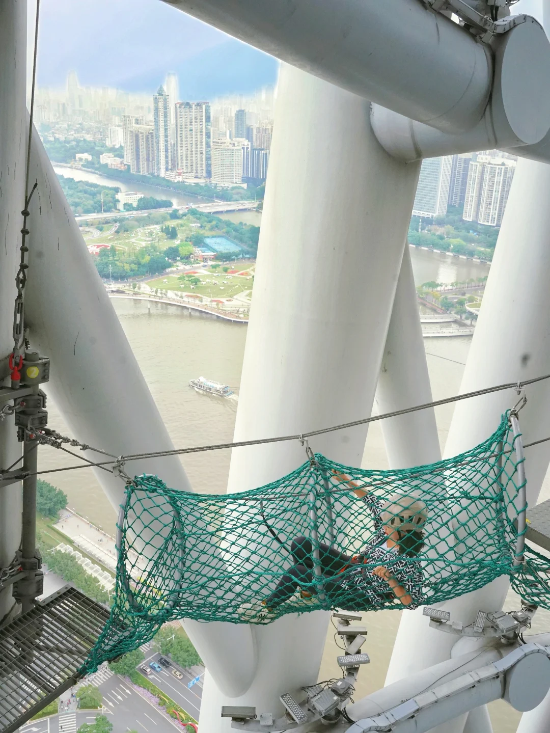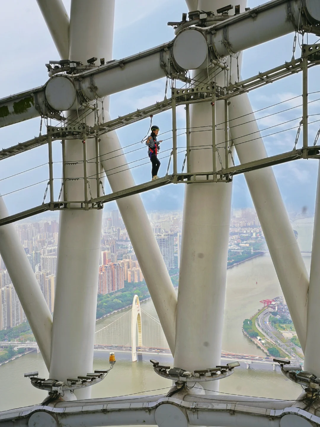 云端步道距离地面325米,比红线还高一点哦,玩法简单,只需要走路就行,绕着广州塔走一圈360度,没有任何玻璃阻挡,随心所欲拍大片,和另一半来这里看夕阳简直不要太浪漫!