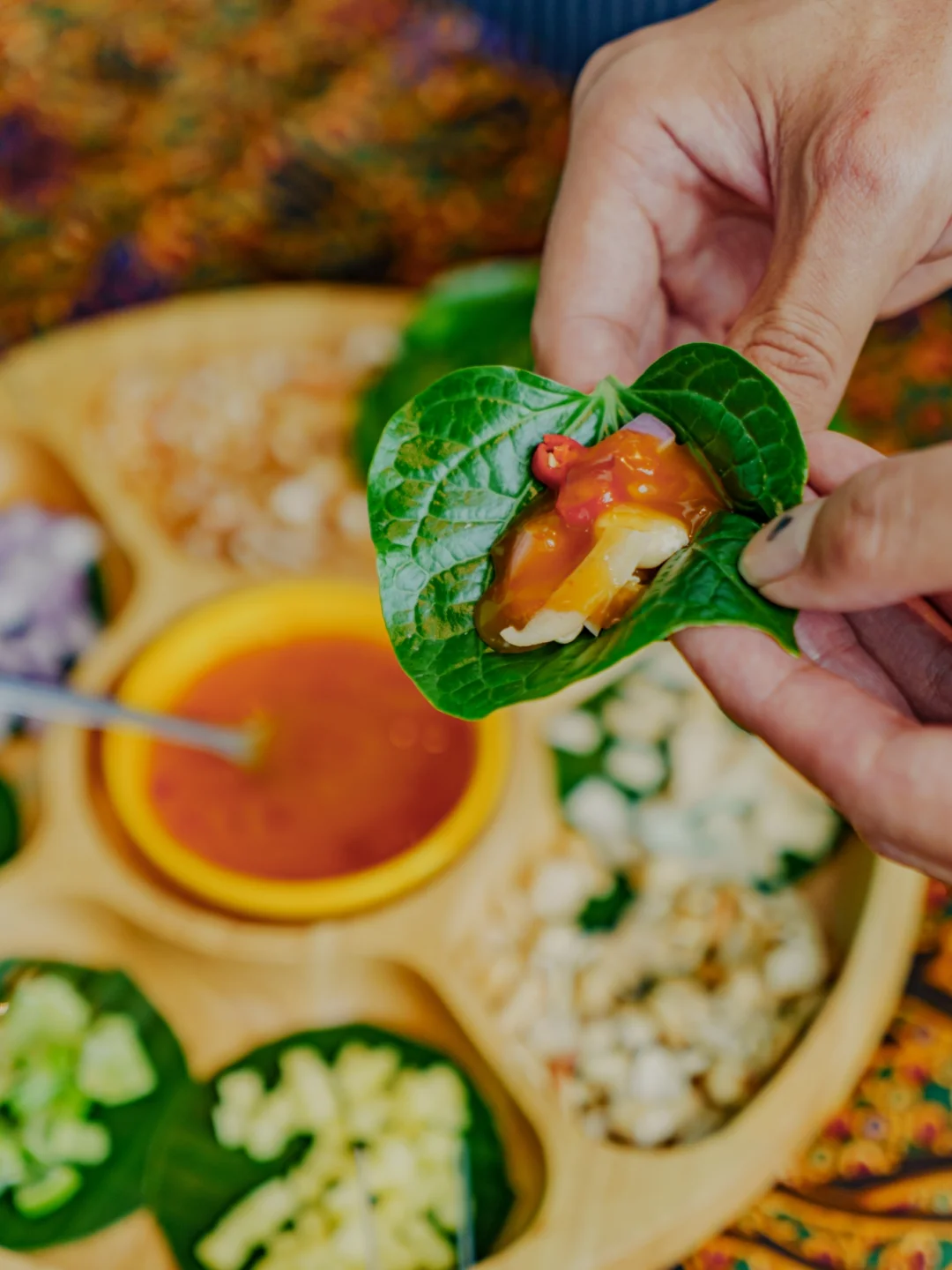 做法:用甲娄叶包裹所以配料,最好加入泰式酸辣酱,然后一口吃下。