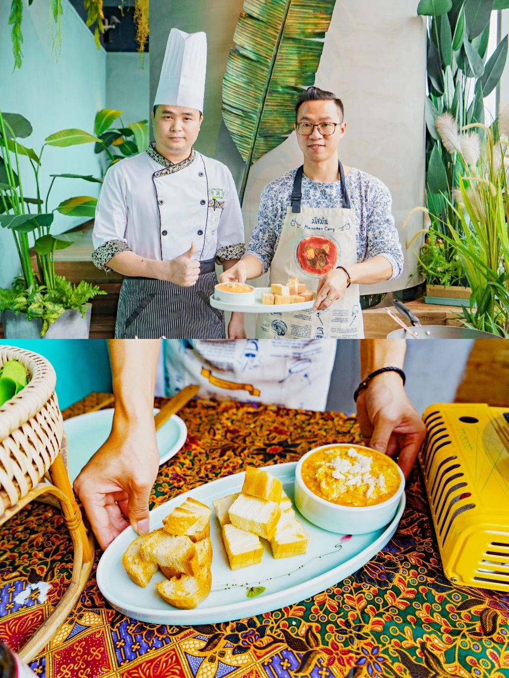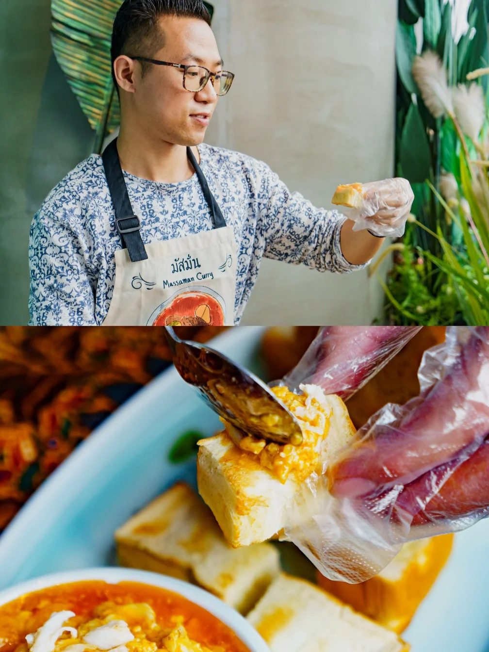 这次厨房准备了专用自制金咖喱酱,海捕泰国深海蓝蟹蟹肉,泰国味露。提前准备好烤好的面包,搭配咖喱蟹肉非常特别的口感。蟹肉和金咖喱酱完美融合只需要很短的三分钟时间,而且文火小煮,需要很深的功底才能把握得刚刚好,这金黄的蟹肉真是超级诱惑,令人垂涎三尺。