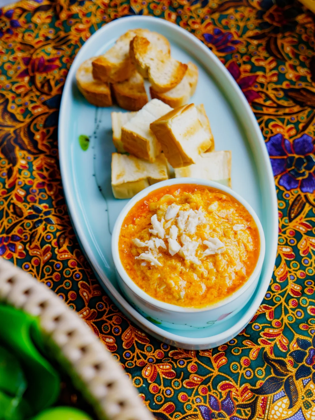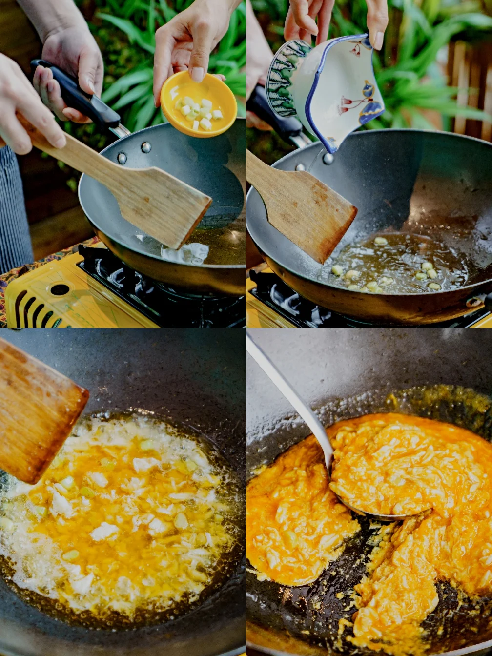 做法:先加入味露和蒜爆炒生香,依次加入加进蟹肉和金咖喱酱,小火煮3分钟,让蟹肉入味,这道菜火候要把控得非常精准,蟹肉才入味的同时鲜嫩可口,必须快速翻炒上桌,趁热加上无水面包一口品尝。